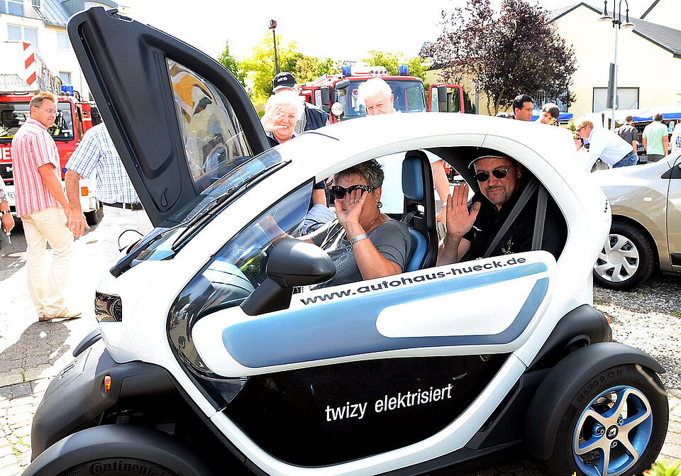Das Elektroauto der Firma Renault, das auch Bürgermeister Hans-Peter Schick testete, sorgte für reichlich Gesprächsstoff. Ist ein solches Auto, das als Quad“ angemeldet wird, 80 km/h schnell ist und über eine Reichweite von 100 Kilometern verfügt, wirklich „landtauglich“? André Hück vom gleichnamigen Renault-Autohaus in Roggendorf berichtete jedenfalls, dass es auch in der Eifel erste Anfragen nach diesem Fahrzeug gibt. Ins etwas „galaktisch“ daherkommende Fahrzeug passen zwei Personen, die nicht nass werden. Hück lachend: „Ich habe das Auto am Freitag aus Köln in Eifel überführt und bin nicht nass geworden. Das Fahren macht zudem wirklich Spaß.“