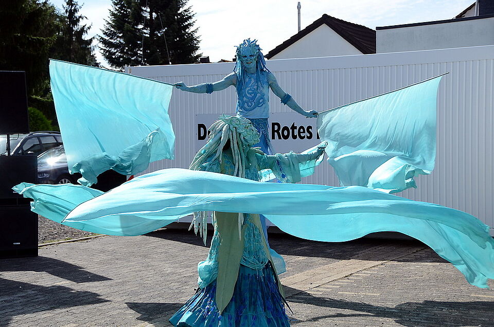 Spektakulär und ästhetisch zugleich präsentierten sich mit blauen Tüchern behangene und wedelnde Stelzenläufer auf dem Brunnenfest. Es waren viele alte Fahrzeuge zu sehen, Traktoren, Autos und Motorräder. Auch der Nationalparkbus „Fagabundus“ war beim 13. Mechernicher Brunnenfest aufgefahren. Organisationsleiter Dirk Gemünd und seine Mannschaft informierten über den Nationalpark Eifel und seinen Förderverein.