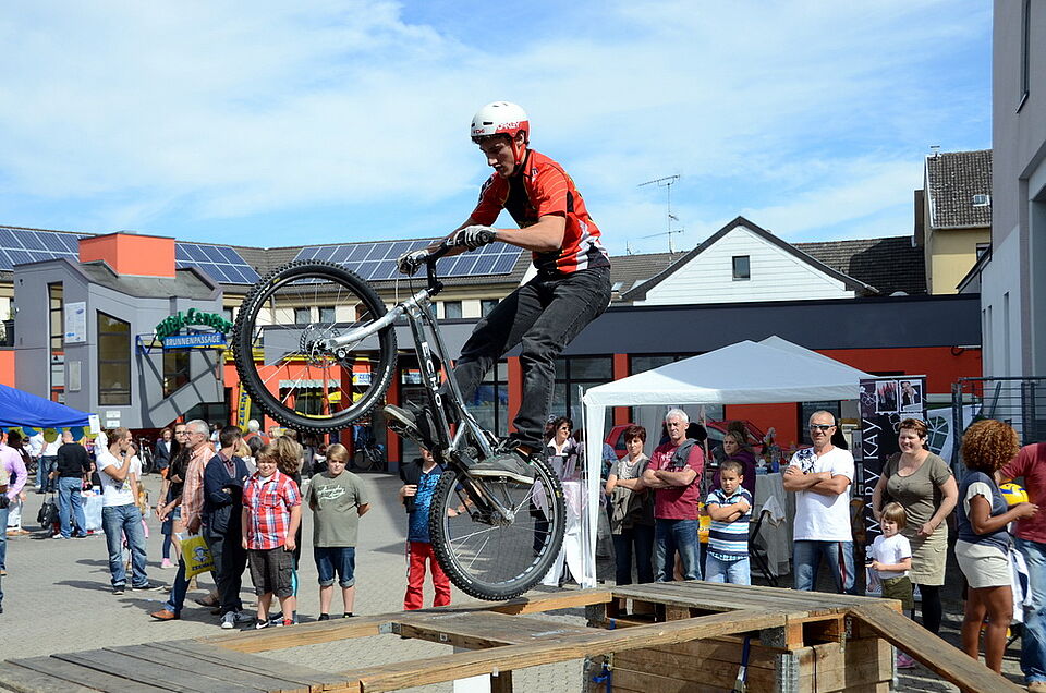 „7 Trial“, das erste Trial-Biker-Team der Eifel mit Sitz in Mechernich-Weiler am Berge, vollführte beim 13. Mechernicher Brunnenfest abenteuerliche Stunts mit Spezialfahrrädern über Hindernisse hinweg Gleich nebenan verarbeiteten der Ratsherr und Ortsvorsteher Johannes Klinkhammer mit seinem Pfarrgemeinde-Team aus Vussem 150 Kilo Teig zu schmackhaften Reibekuchen .