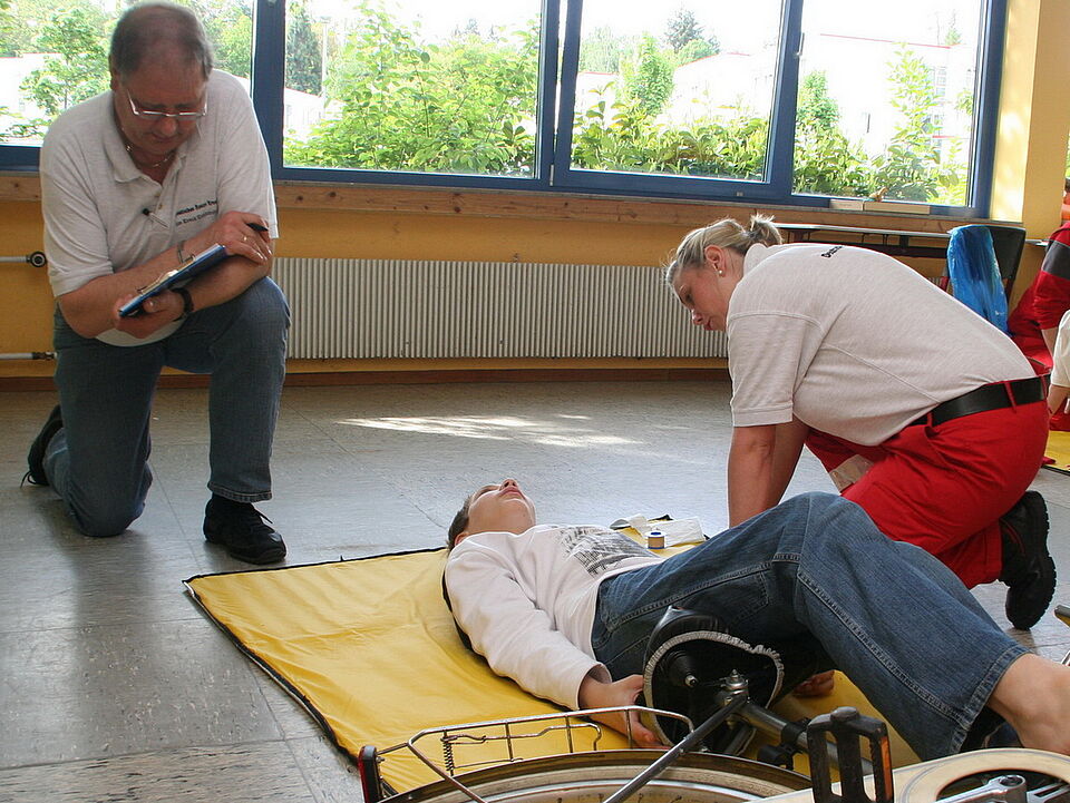 Den ganzen Tag lang wurden Verbände angelegt, Knochenbrüche versorgt, Herz-Lungen-Wiederbelebungen durchgeführt, gestürzte Radfahrer gerettet und vieles mehr. Damit Verletzungen und Erkrankungen auch realistisch aussahen, kümmerte sich das Team für realistische Unfalldarstellung um Gaby Schleiermacher mit Knete, Schminke und Kunstblut um ihre "Verletzten".