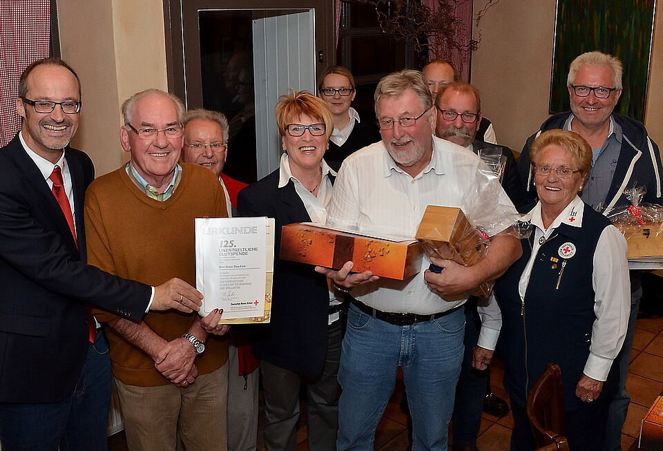 Für 25maliges Blutspenden ausgezeichnet wurden Bernd Dirk Danilkin, Martina Ernst, Ingo Gustav Helmut Heitmann, Stephanie Jansen, Heike Röttgen, Wolfgang Christoph Schmitz, Markus Simons und Susanne Vus. 50 Mal zur Ader ließen sich Jörg Bodenhausen (50) und sein Vater Paul-Josef (75), Hans-Josef Breuer, Hubertine Deist, Sabine Dohmen, Dieter Fahl, Christine Greuel-Heiroth und Anja Maria Ordziniak. Hundertmal spendete, wie eingangs erwähnt, Hubert Breuer. 125 Mal je einen halben Liter Blut gaben Heinz-Theo Eich und Heinz Schmitz.