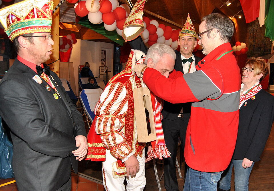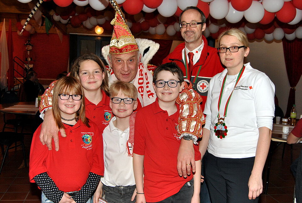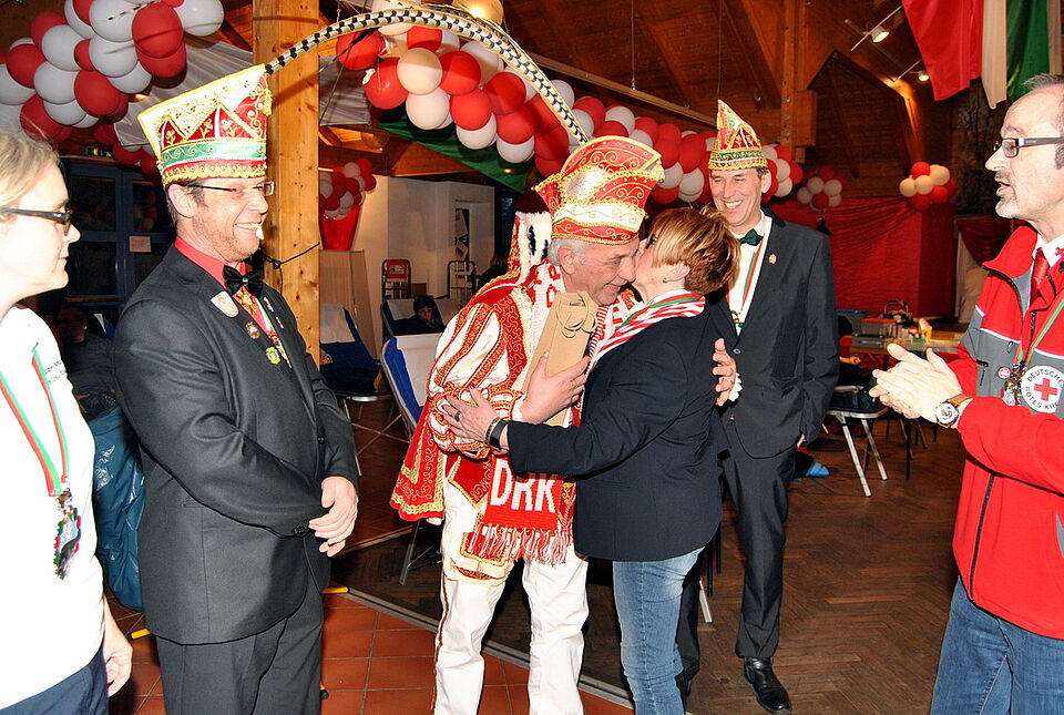 Mit Präsenten und einem Schal des Roten Kreuzes, der farblich perfekt zum Ornat des Prinzen passte, bedankte sich Klöcker für den Einsatz. Zuvor hatte Prinz Rolf III. die Verantwortlichen des Roten Kreuzes und des Blutspendedienstes mit Sessionsorden dekoriert. Dabei vergaß er auch nicht den DRK-Nachwuchs. Den fünf Kindern aus der Gruppe von Betreuerin Nicole Thielen steckte er als Anerkennung für ihre Mithilfe kleine Orden an. Die Fünf- bis Zehnjährigen halfen beispielsweise mit Feuereifer beim Aufräumen und versorgten die Spender mit Getränken. Außerdem waren acht weitere ehrenamtliche Helfer des DRK-Ortsvereins stundenlang im Einsatz, damit sich die Blutspender am leckeren Büfett mit kalten und warmen Speisen stärken konnten.