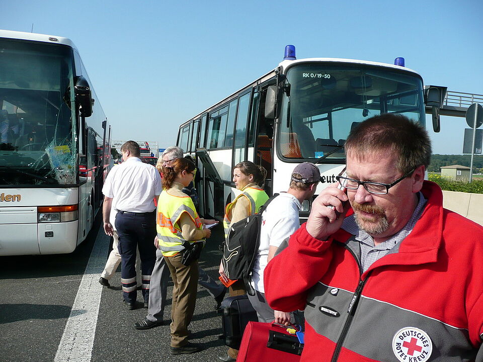 Samstagabend fiel auf der Eifelautobahn A 1 bei Mechernich ein Mann bei voller Fahrt aus einem Reisebus. Scheinbar hatte er wirklich einen guten Schutzengel, er wurde, schwer, aber vermutlich nicht lebensgefährlich verletzt und vom Rettungsdienst in das Mechernicher Krankenhaus transportiert. Das Rote Kreuz im Kreis Euskirchen war außerdem mit seinem Einsatz- und Evakuierungsbus und einem Team seines Kriseninterventionsdienstes im Einsatz, um die schockierten Businsassen zu betreuen und bis in ihre Heimatdörfer im Prümer Raum zu begleiten.