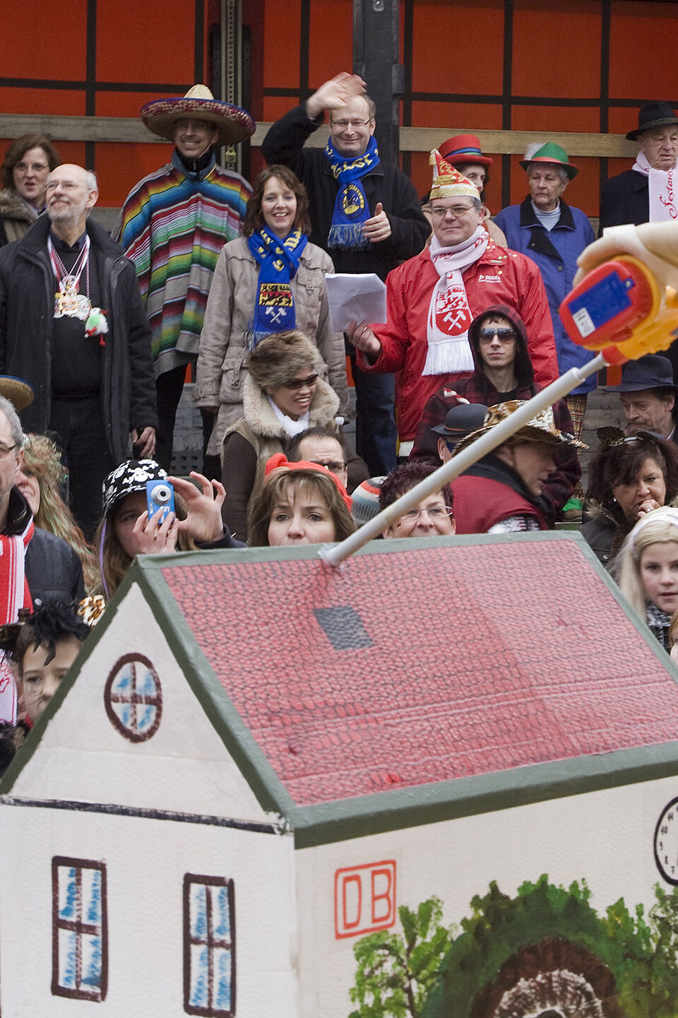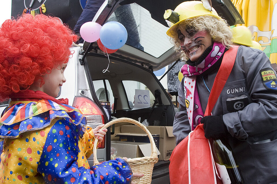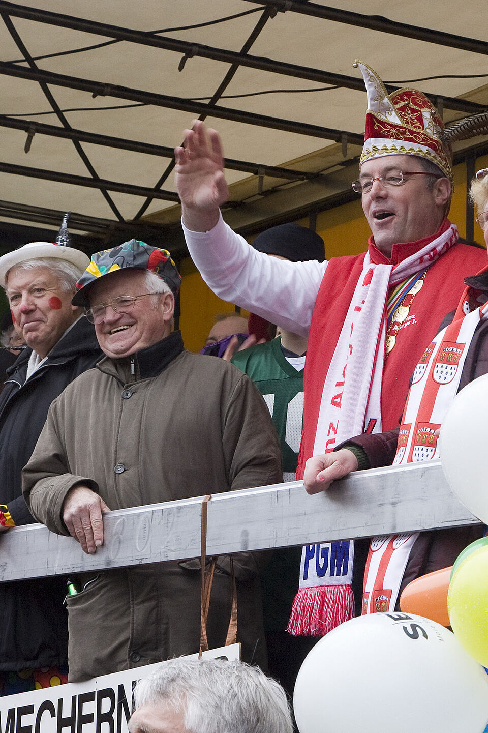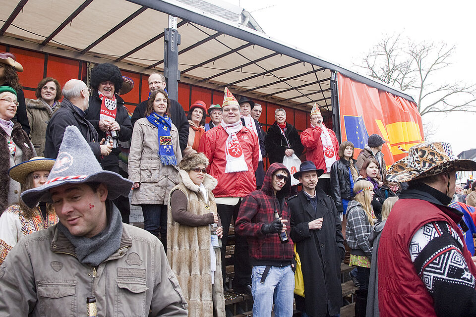 Dr. Hans-Peter Schick, Mechernichs Bürgermeister, zeigte den „Blaumänn“ von der Ehrentribüne aus herzlich lachend den „Hochdaumen“. Auf der Tribüne hatten sich neben dem ersten Bürger der Stadt auch der ehemalige Ratsherr Winfried Simon eingefunden, der vor 25 Jahren Mechernicher Prinz war, sowie Pfarrer und Regionaldekan Erik Pühringer, der seinerzeit als Karnevalsprinz Bibeln verteilte.