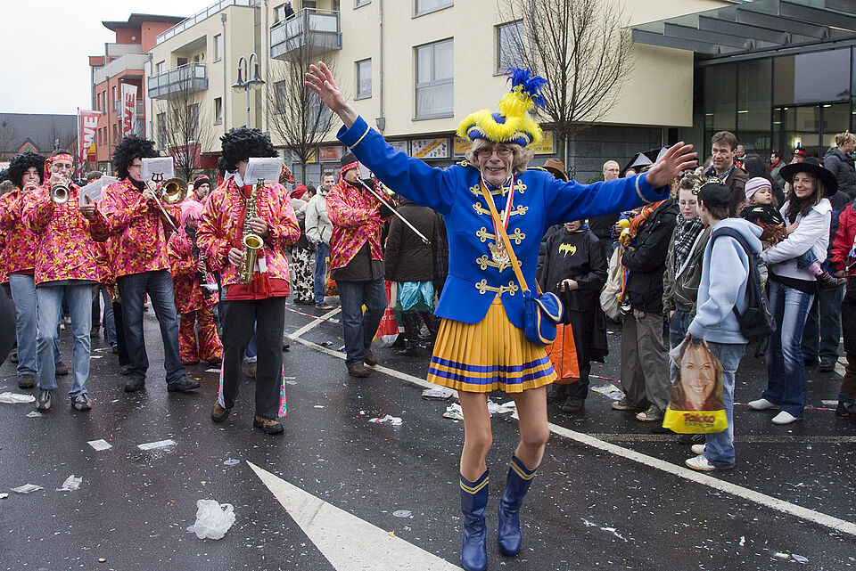 Auch die Karnevalisten aus dem „benachbarten Ausland“ Kommern wurden gebührend gefeiert: Die KG Greesberger Kommern, die „Greesgirls“ und das Kommerner Prinzenpaar Prinz Frank I. und Prinzessin Lisa I. (Weber) zogen ebenso durch die Mechernicher Straßenschluchten wie das Tambourcorps Kommern.