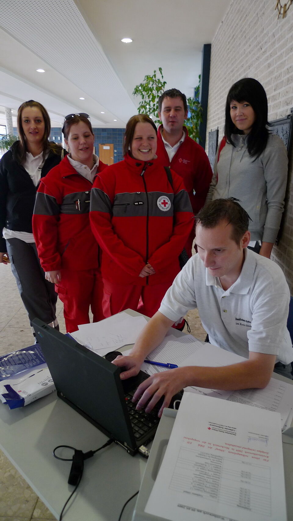 Bild DRK ZR | Ah... jetzt wird die Sache langsam klarer. Das Rote Kreuz veranstaltet im Mechernicher Turmhof-Gymnasium einen großen Erste Hilfe-Wettbewerb. Dazu treffen sich neun Wettbewerbsgruppen aus dem ganzen Kreisgebiet. Hier die Rotkreuzgruppe aus der Kreisstadt Euskirchen...