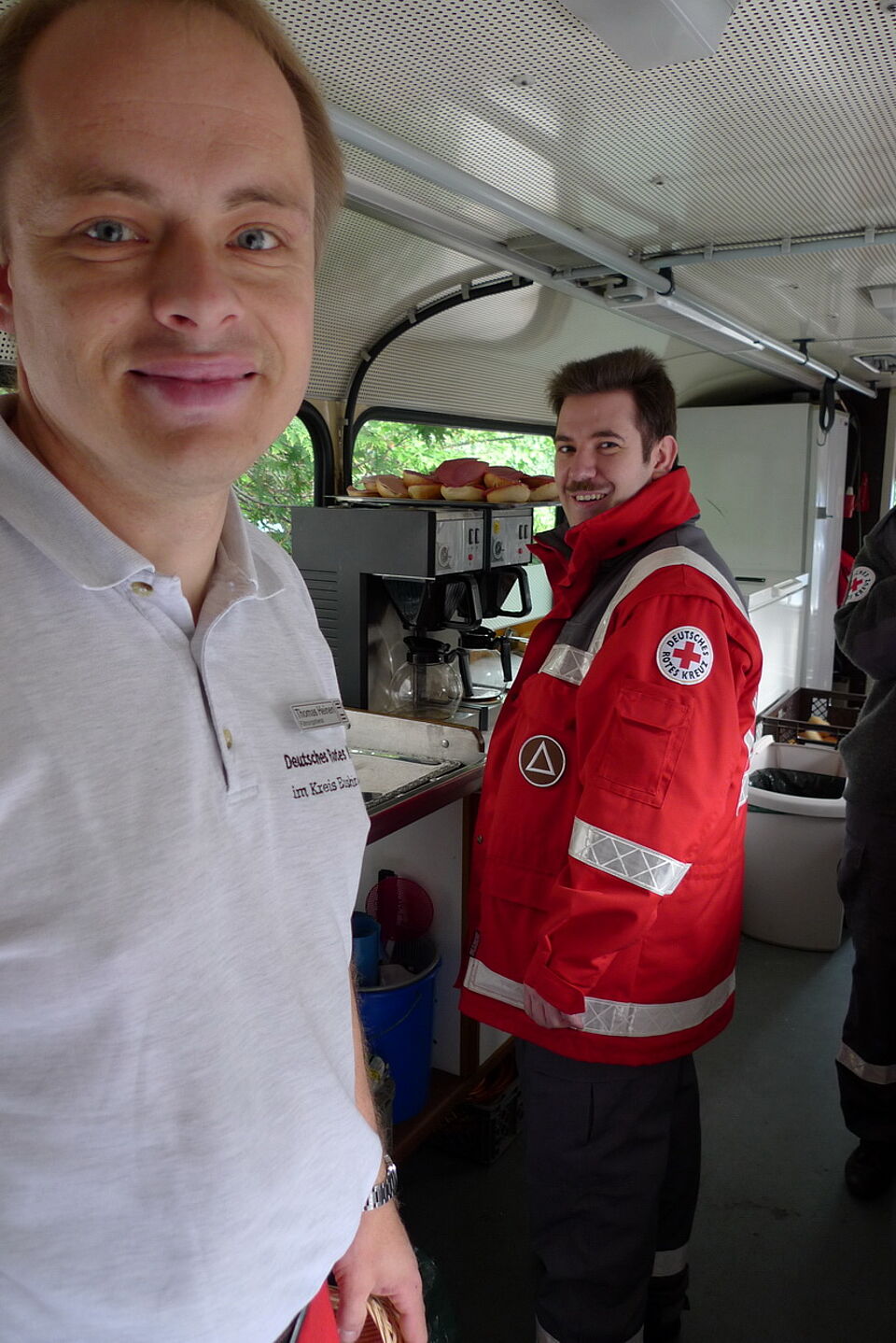 Bild DRK ZR | Um die Verpflegung braucht man sich beim Roten Kreuz keine Sorgen zu machen. Die ist immer gesichert. Diesmal versorgt die Zülpicher Betreuungsgruppe um Gaby Weinand (l) sogar zwei Veranstaltungen gleichzeitig. Neben dem Erste Hilfe-Wettbewerb mit mehr als 100 Teilnehmern und Mitgliedern im Organisationsteam werden auch die Einsatzgruppen auf der Euskirchener Maikirmes verpflegt.