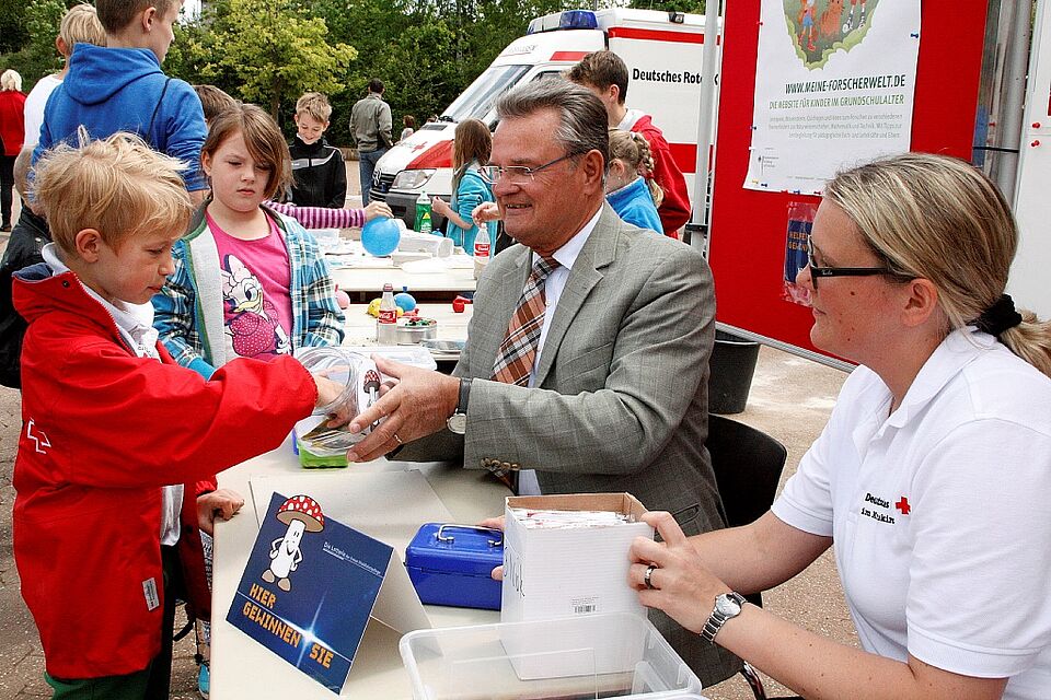 Nebenan war das „Haus der kleinen Forscher“ dicht umlagert. Dahinter steht eine bundesweite Stiftung, deren lokales Netzwerk DRK-Kreisgeschäftsführer Klöcker koordiniert. „Ziel ist es, pädagogische Kräfte in Workshops zu schulen. Sie sollen die Kinder neugierig machen, ihre Umwelt zu verstehen, vor allem bei naturwissenschaftlichen, technischen und mathematischen Themen“, so Klöcker.