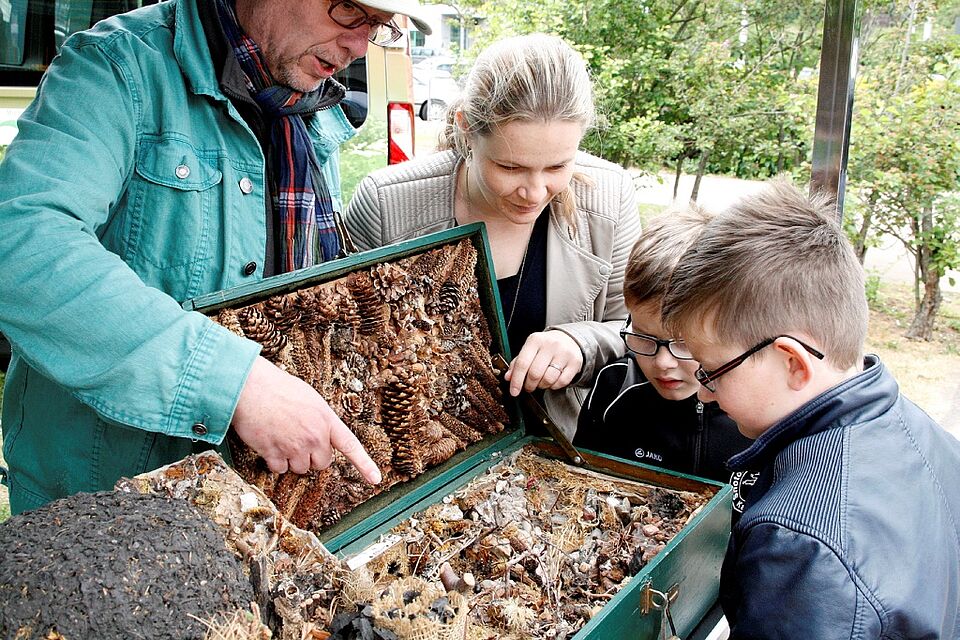 Kleine Entdecker kamen auch beim Förderverein Nationalpark Eifel auf ihre Kosten. Die Nationalpark-Experten waren mit dem Infomobil „Fagabundinus“ angereist und hatten unter anderem einen kleinen Schaukasten mit ausgetrockneten Käfern, Wurzeln, Moos, Rinden und Hölzern im Gepäck. „Das ist der Nationalpark Eifel im Kofferformat“, grinste Dirk Gemünd vom Förderverein. Rund 5000 Arten haben die Fauna und Flora im Nationalpark, so der Experte.