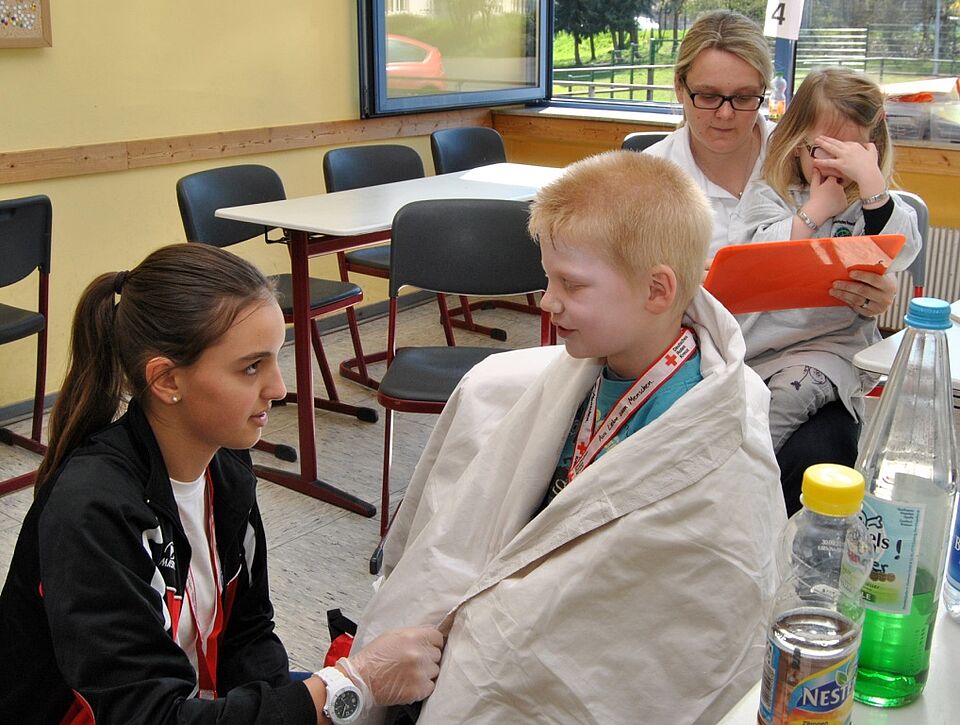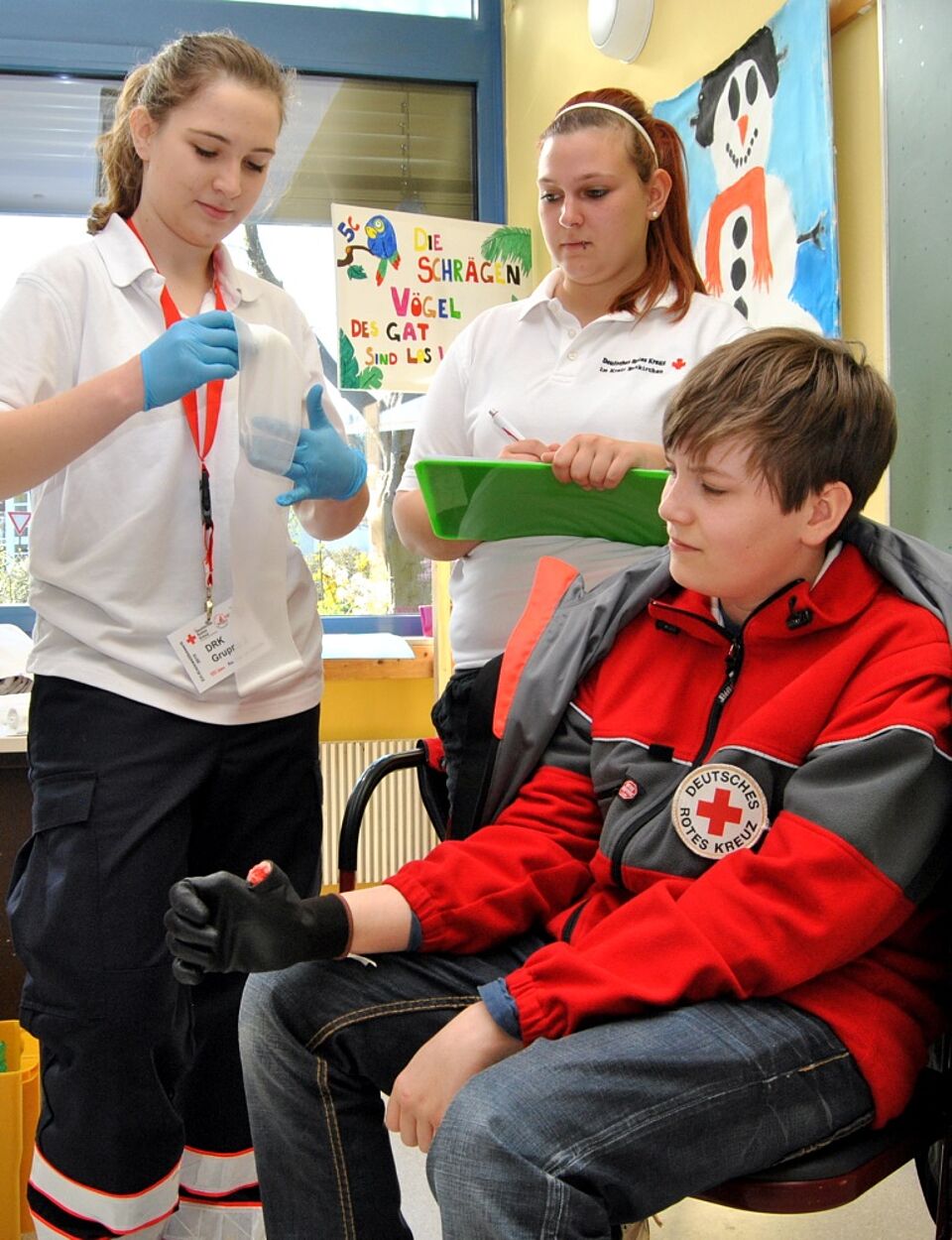 Auf insgesamt 20 Wettbewerbsgruppen, darunter überwiegend Jugendrotkreuz- und Schulsanitätsgruppen, aber auch zwei erwachsene Rotkreuz-Gruppen, warteten in den Klassenräumen unterschiedliche Notfallsituationen, wie sie sich jederzeit auch in der Realität ereignen können. Hilfeschreie schallen durch den Flur, ein Schüler ist bei einer Rauferei mit dem Kopf auf die Tischkante aufgeschlagen, die Ersthelfer eilen herbei und versorgen den Jungen.