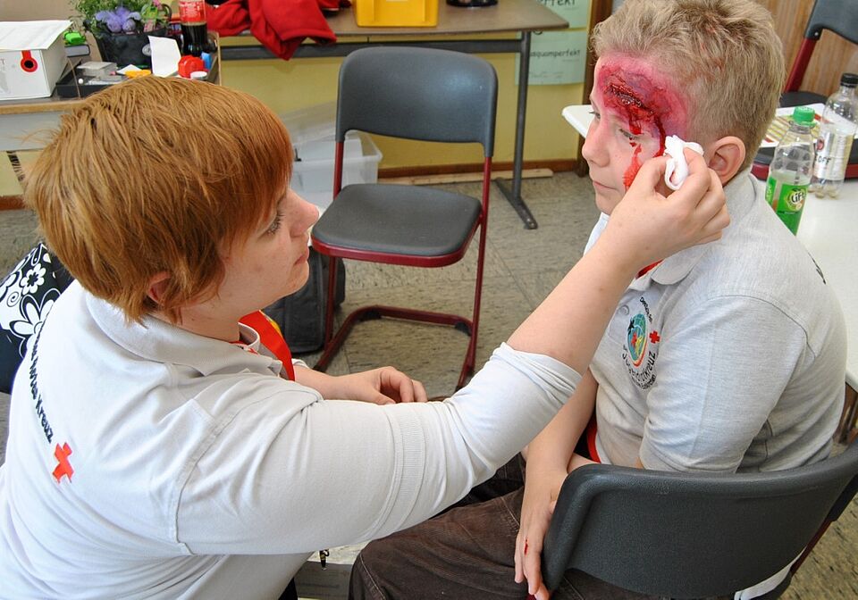 Mechernich/Kreis Euskirchen – Der Schminktrupp hatte ganze Arbeit geleistet: Die klaffende Fleischwunde am Kopf sah ebenso wirklichkeitsgetreu aus wie der versehentlich mit der Rosenschere amputierte Daumen. „Realistische Unfalldarstellung“ nennt sich die Spezialität von Laura Zimmermann, Leiterin des Jugendrotkreuzes im Kreisverband Euskirchen, und ihren Helfern. Das Rote Kreuz schult darin nicht nur die „Maskenbildner“, sondern auch die Darsteller. Denn einen Unfall oder eine Erkrankung möglichst realistisch und detailgetreu darzustellen, hilft vor allem den noch unerfahrenen Jugendrotkreuzlern, sich auf den Ernstfall vorzubereiten und die Scheu gegenüber den Verletzten oder Erkrankten abzubauen.