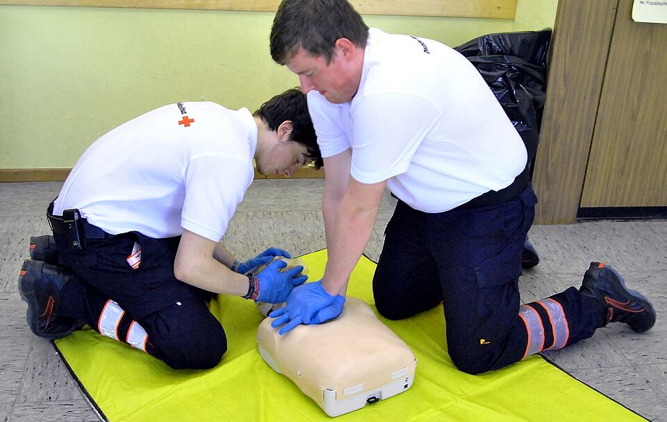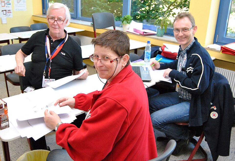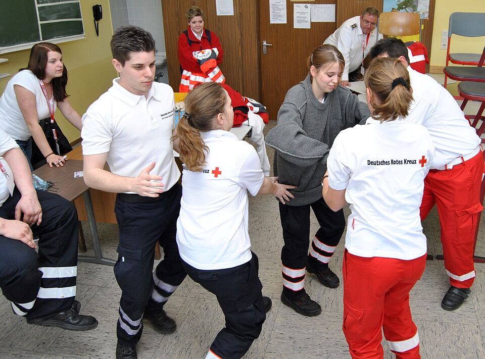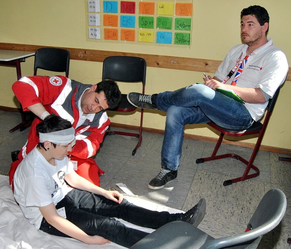 Gleich mit mehreren Verletzten hatten es die Wettbewerbsteilnehmer bei einem anderen Szenario zu tun: Beim Renovieren stürzt ein Schüler von einer gewagten Tisch-Stuhl-Konstruktion. Er klagt über starke Rückenschmerzen, ein weiterer Schüler steht unter Schock, der Lehrer hat einen Herzinfarkt. Denken alle Helfer daran, sich Handschuhe überzustreifen? Wird der Lehrer korrekt reanimiert? Wie stehen die Ersthelfer dem unter Schock stehenden Schüler bei? Nach diesen und vielen anderen Kriterien bewerteten die Schiedsrichter nach einem Punktesystem die Leistungen der Wettbewerbsteilnehmer. Ausgewertet wurden die Ergebnisse vom Kreisauskunftsbüro des DRK-Kreisverbandes, dessen Aufgabe es normalerweise ist, die Daten von Betroffenen bei Einsätzen zu erfassen.