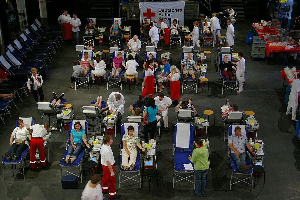 Am Eingang verteilten dann gut gelaunte Rotkreuzler Gummibärchen. Nach der Anmeldung und dem Ausfüllen eines Gesundheitsfragebogens wurden die Spendewilligen auch schon zum ersten Mal gepikst. Mit Hilfe des Bluttropfens aus dem Ohrläppchen bestimmten die Helfer den Eisenwert. Auch die Körpertemperatur wurde anhand eines Ohrfieberthermometers gemessen. Nach einem Arztgespräch ging es schließlich zur eigentlichen Blutspende. Einen halben Liter ließen die Spender jeweils aus ihrer Vene in die mit einer die Gerinnung verhindernden Flüssigkeit vorgefüllten Beutel, die sich auf Schüttelwagen hin und her bewegten, fließen. Hierfür waren nicht die Rotkreuzler aus dem Kreis Euskirchen zuständig, sondern 40 Hauptamtliche und sechs Ärzte vom DRK-Blutspendedienst West. Um auch ihnen Pausen, während der hochkonzentrierten Arbeit ermöglichen zu können, arbeiteten sie in drei Teams. „Wir wissen, dass wir solche Veranstaltungen gut vorbereiten können. Aber wie viel Blut am Ende zusammenkommt, wissen wir nicht. Das ist das Spannende“, fand Petra Klostermann, Referentin für Öffentlichkeitsarbeit des DRK-Blutspendedienstes West.