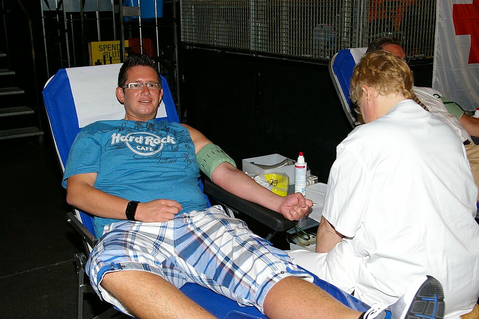 Mechernich-Firmenich – „Rechts oder links?“, fragt die Dame am Eingang zum „Zapfplatz“, um den Blutspendern eine entsprechende Liege zuzuweisen. Genau 689 „anonyme Lebensretter“ hielten beim 7. Blutspende-Marathon des Roten Kreuzes im Kreis Euskirchen den rechten oder linken Arm hin. Dabei konnten sich 30 Blutspender zugleich dort hinlegen, wo sonst getanzt wird: Wieder einmal war die Diskothek „TON-Fabrik“ in der Kultur- und Freizeitfabrik Zikkurat in Mechernich-Firmenich Ort des Geschehens. Am Ende des Tages freute sich Thomas Heinen, Rotkreuz-Gemeinschaftsleiter und Hauptkoordinator des Blutspende-Marathons, sehr über die Resonanz: „Für dieses Bombenwetter war das mehr als ein großer Erfolg.“ Mit 154 Erstspendern konnte das Ergebnis vom vergangenen Jahr sogar noch um 30 Personen überboten werden.