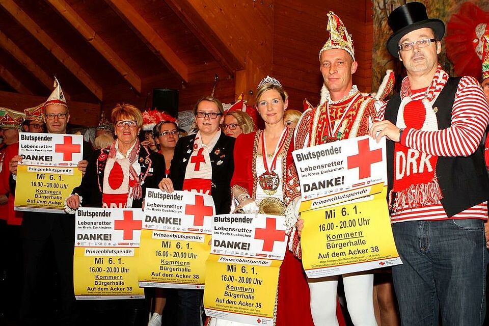 Sofort nach der Inthronisierung wurde es dann etwas ernsthafter, denn es ging um einen guten Zweck. Auf der Bühne machten Rolf Klöcker, Geschäftsführer des Rotkreuz-Kreisverbandes und seine Mitstreiter sich stark für die Prinzenblutspende der Kommerner Karnevalisten. „Am 6. Januar freuen wir uns auf die Prinzenblutspende in der Kommerner Bürgerhalle, wir sind ausgesprochen froh, dass wir auch die Kommerner Jecken auf unserer Seite haben“, kündigte Klöcker an. „Wir freuen uns auf den Termin und hoffen, das Deutsche Rote Kreuz bei der Sache gut unterstützen zu können“, kommentierte Prinz Thomas I. das Vorhaben.