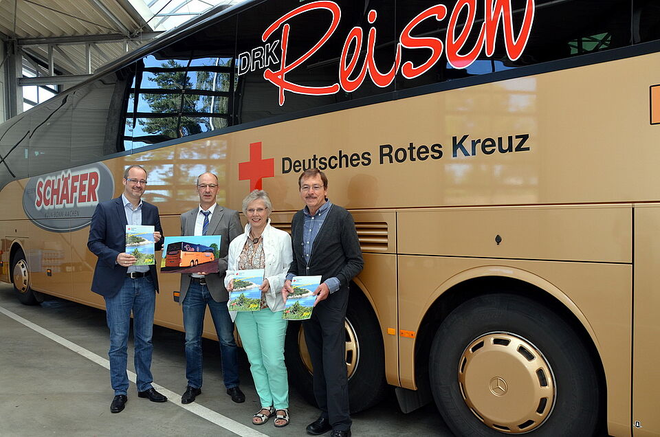 Jetzt stellten die Busunternehmer Rolf Schäfer und Guido Bauer gemeinsam mit Rotkreuz-Kreisgeschäftsführer Rolf Klöcker und der DRK-Servicereisebeauftragten Monika Dormagen einen neu dekorierten Fernreisebus vor, der ab sofort für das Servicereiseprogramm des Roten Kreuzes im Kreis Euskirchen sowie für das Bundeswehr-Sozialwerk Werbung macht.