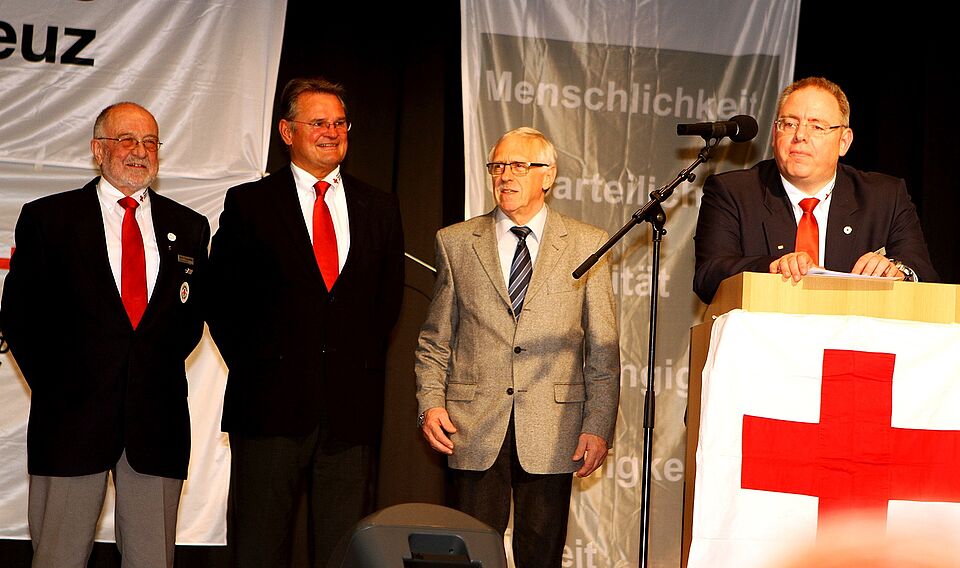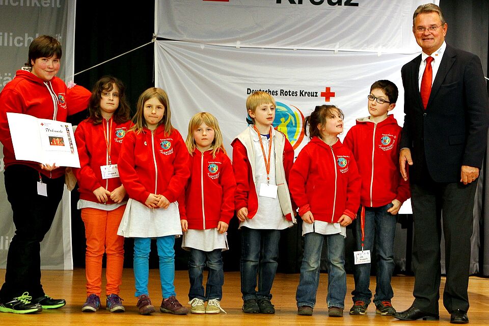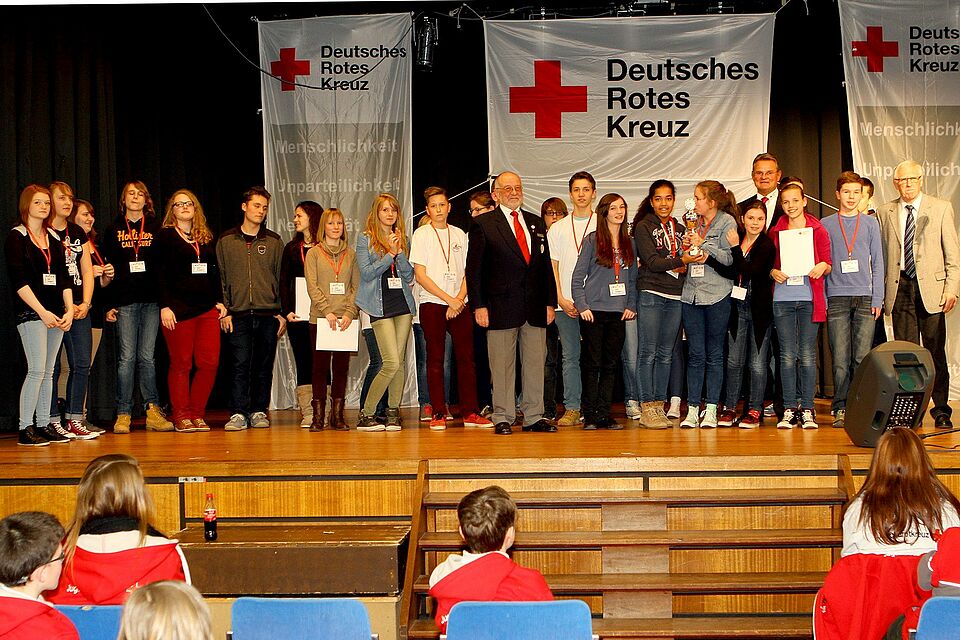 Zur Siegerehrung war auch Landrat und Rotkreuz-Schirmherr Günter Rosenke nach Mechernich gekommen: „Ich freue mich immer auf die Siegerehrung und habe die Jubelschreie der Gewinner aus dem Vorjahr noch im Ohr“, so das Kreisoberhaupt auf der Bühne der Aula des Mechernicher Gymnasiums. Unterstützt wurde Rosenke vom stellvertretenden Bürgermeister der Stadt Mechernich, Peter Wassong. Bei ihm bedankte sich Frank Gummelt: „Wenn die Stadt Mechernich uns nicht die Räumlichkeiten zur Verfügung stellen würde, könnten wird diesen Wettbewerb gar nicht durchführen, deshalb bedanken wir uns dafür sehr.“