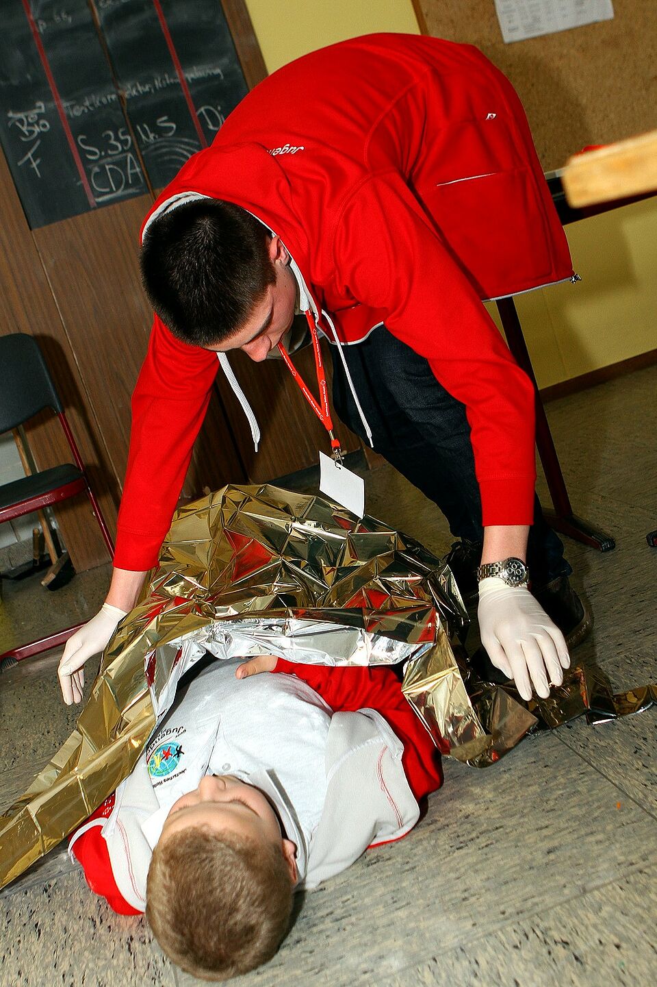 Mechernich - „So viele Teilnehmer haben wir noch nie gehabt, dabei hat uns sogar noch eine Mannschaft aus gesundheitlichen Gründen abgesagt“, freute sich der Bereichsleiter Jugend des Roten Kreuzes im Kreis Euskirchen, Simon Jägersküpper. Die Rede war vom Erste-Hilfe-Wettbewerb in den Räumen des Mechernicher städtischen Gymnasiums „Am Turmhof“ (GAT), bei dem in 20 Teams mehr als 200 Rotkreuzler in drei verschiedenen Leistungsklassen an den Start gingen.