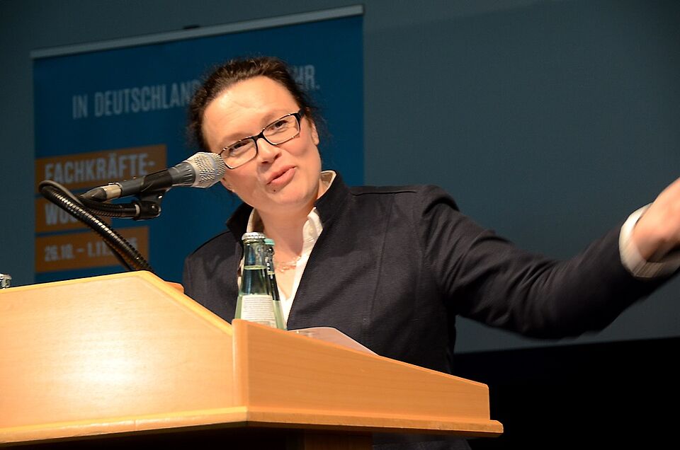„Der Elektriker in meinem Dorf“, hielt Andrea Nahles dagegen, „hat mir gesagt, er stellt sofort drei Flüchtlinge als Stifte ein, wenn sie einigermaßen Deutsch können und sich geschickt anstellen.“ Wollseifer lenkte ein: „Wir haben 600.000 Fachkräfte zu wenig in Deutschland, aber die Betonung liegt auf Fachkräfte. Die müssen erst einmal ausgebildet werden. Wenn wir alle zusammenhalten, können wir das auch schaffen.“ Und, zur Ministerin gewandt: „Es ist richtig und wichtig, dass wir den Menschen im Land sagen, dass die Flüchtlingswelle keinen Verdrängungswettbewerb am Arbeitsmarkt auslöst!“