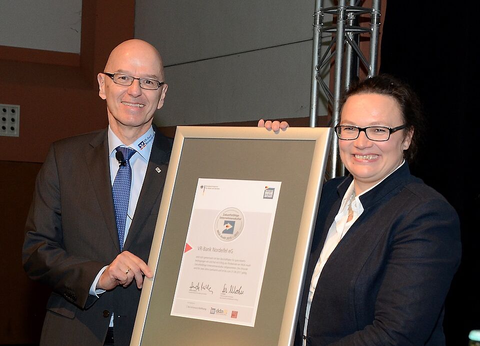 Und zwar an die VR-Bank Nordeifel, die seit 2012 als eines der ersten zehn Pionier-Unternehmen bundesweit an der Testphase des INQA-Projektes mitgewirkt und jetzt als zweites Unternehmen in der Bundesrepublik erfolgreich abgeschlossen hatte.