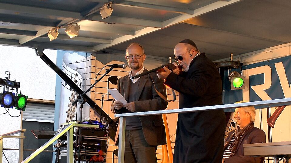 Doch zunächst ließ Wassong nach dem Einzug sämtliche Musikvereine vor der RWE-Bühne antreten und dort gemeinsam unter dem Dirigat von Uli Poth (Bergkapelle Mechernich) die lokale Nationalhymne „Bergmann, Glück auf“ anstimmen. Viele sangen mit – ebenso bei der darauf folgenden deutschen Nationalhymne, die alle daran erinnerte, dass es neben „40 Jahre Stadt Mechernich“ am Samstag auch 25 Jahre deutsche Wiedervereinigung zu feiern galt.