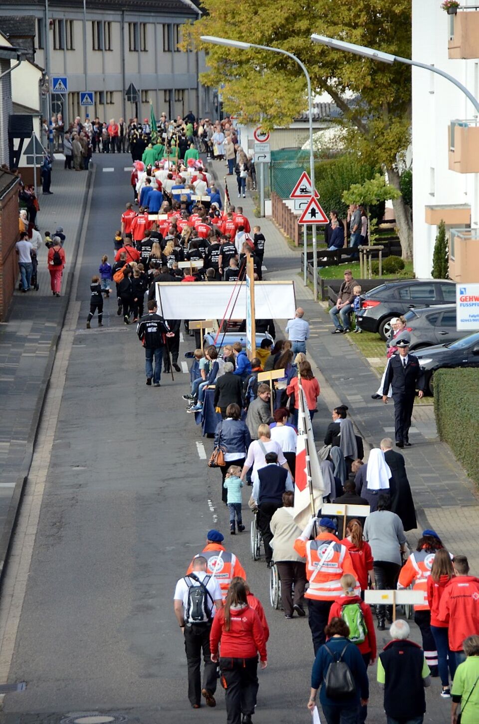 Dort hatte das Mechernicher Stadtjubiläum am Freitagabend mit einem Festakt begonnen. Der Samstag nahm mit einem Festzug aus über 600 Teilnehmern seinen Auftakt, darunter auch eine Fahnenabordnung, Bereitschaft und Jugendrotkreuz des von Kreisgeschäftsführer Rolf Klöcker ehrenamtlich geführten DRK-Ortsvereines Mechernich.