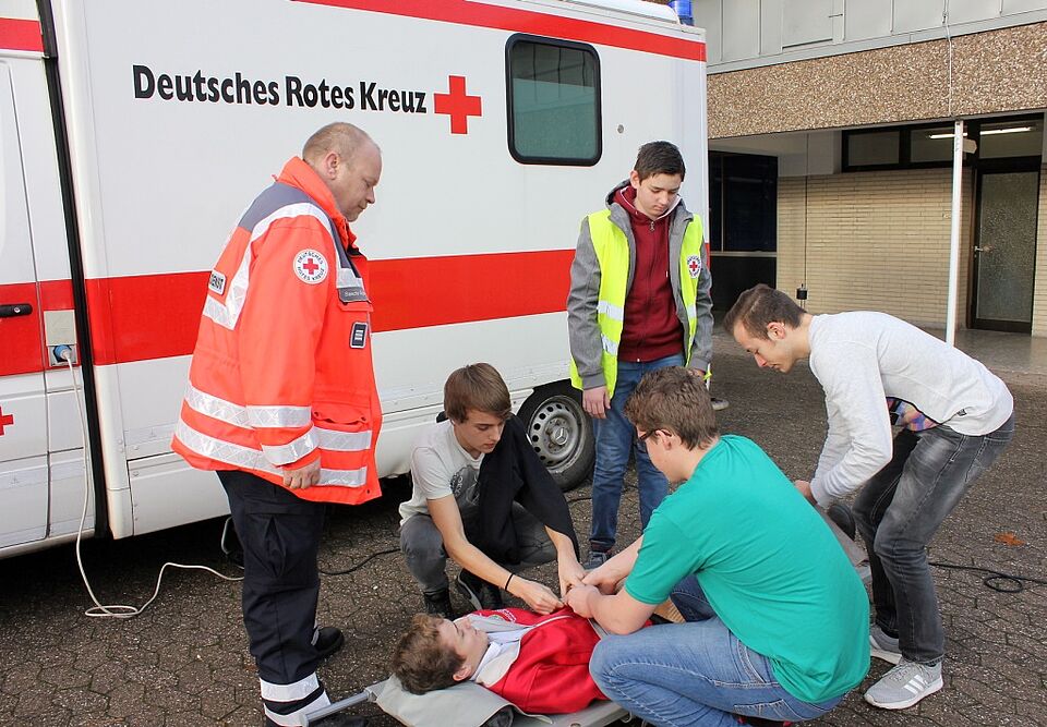 Mechernich – „Fürs Helfen gibt es kein »zu klein«“, erklärte Rotkreuz-Gemeinschaftsführer Sascha Suijkerland beim „Tag der offenen Tür“ am Gymnasium „Am Turmhof“ (GAT) die Idee hinter den Schulsanitätern, die das Rote Kreuz im Kreis Euskirchen ausbildet. Zum einen seien diese im Alltag eine große Hilfe: „Sie können Situationen einschätzen und den Einsatz von Rettungskräften vorbereiten sowie kleinere Wehwehchen verarzten“, so Suijkerland. Zum anderen fördere das Engagement bei den Schulsanitätern die sozialen Kompetenzen. Suijkerland: „Hier am GAT ist das Interesse mitzumachen besonders groß.“ Einige der Schulsanitäter sind zugleich im Mechernicher Jugendrotkreuz aktiv. Das war auch beim Tag der offenen Türe vertreten und fühlte den Besuchern mit einem „Erste-Hilfe-Test“ auf den Zahn.