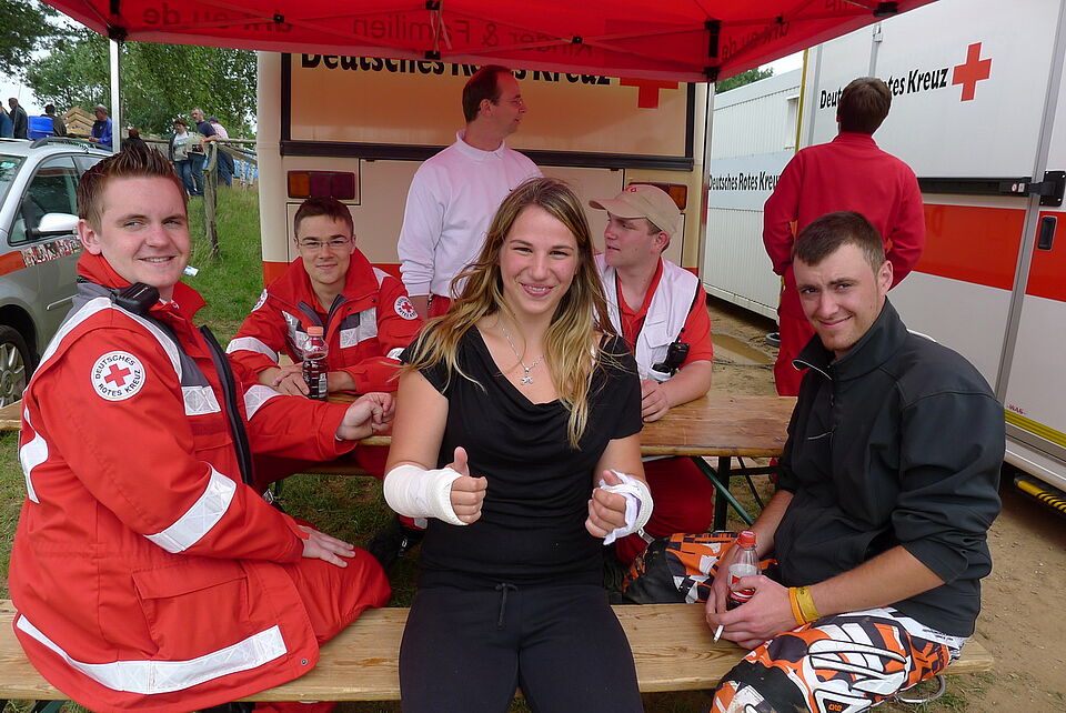 Bild DRK ZR | Diese junge Rennfahrerin konnte sich schon am Tag nach ihrem Unfall wieder fröhlich zu den Rotkreuzhelfern setzen die sie am Tag zuvor von der Strecke geholt hatten.