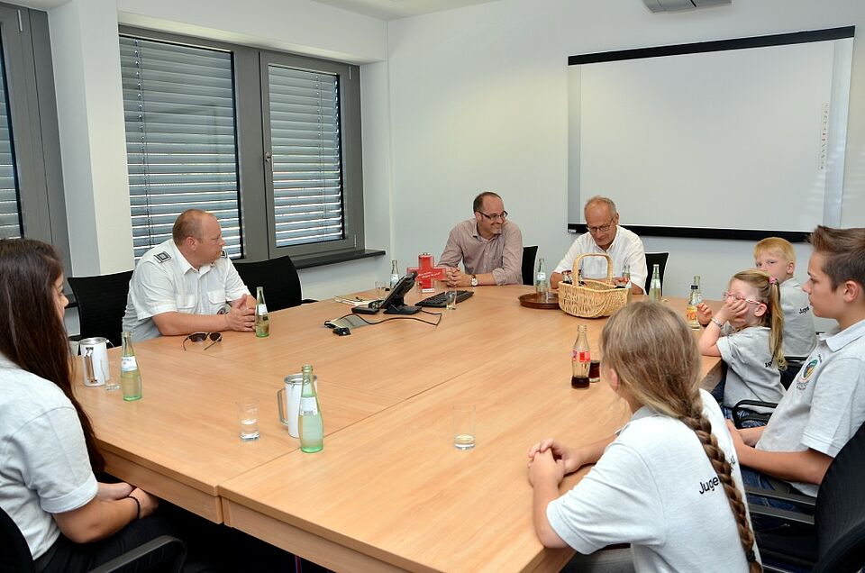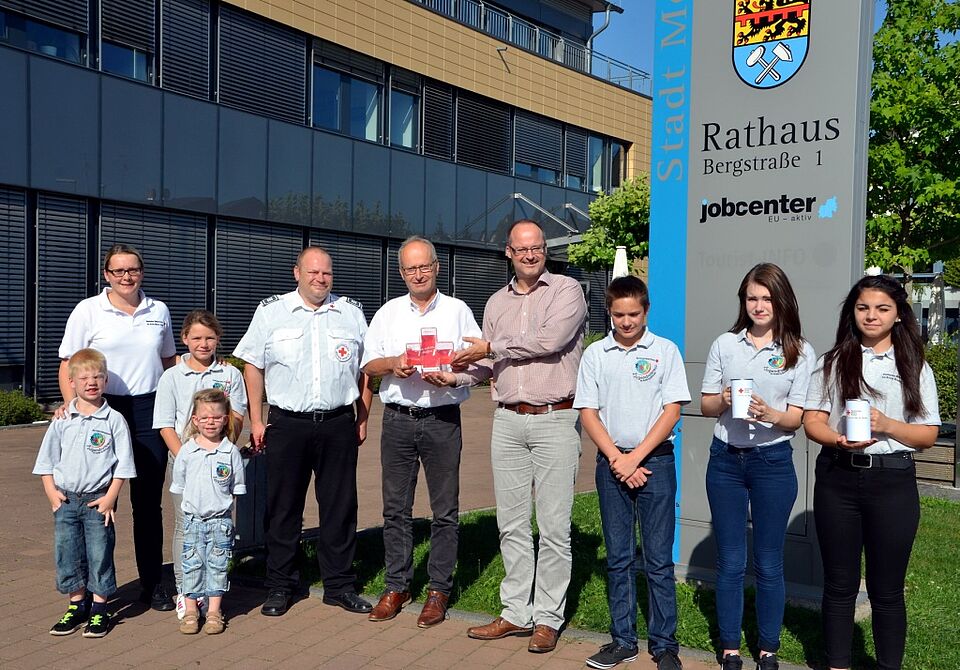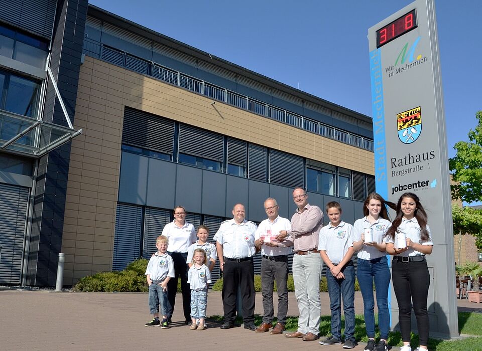 Ab Montag, 21. September, gehen die 20 Mitglieder der von Sascha Suijkerland geleiteten Rotkreuz-Bereitschaft „Klinken putzen“ – und zwar gemeinsam mit den knapp 40 Angehörigen des von Nicole Thielen geführten Jugendrotkreuzes. Weil es so heiß war beim Fototermin vor dem Rathaus, lud Bürgermeister Schick die Jugendrotkreuzler und ihre Begleiter auf eine kalte Limo und einen angeregten Meinungsaustausch ins Rathaus.