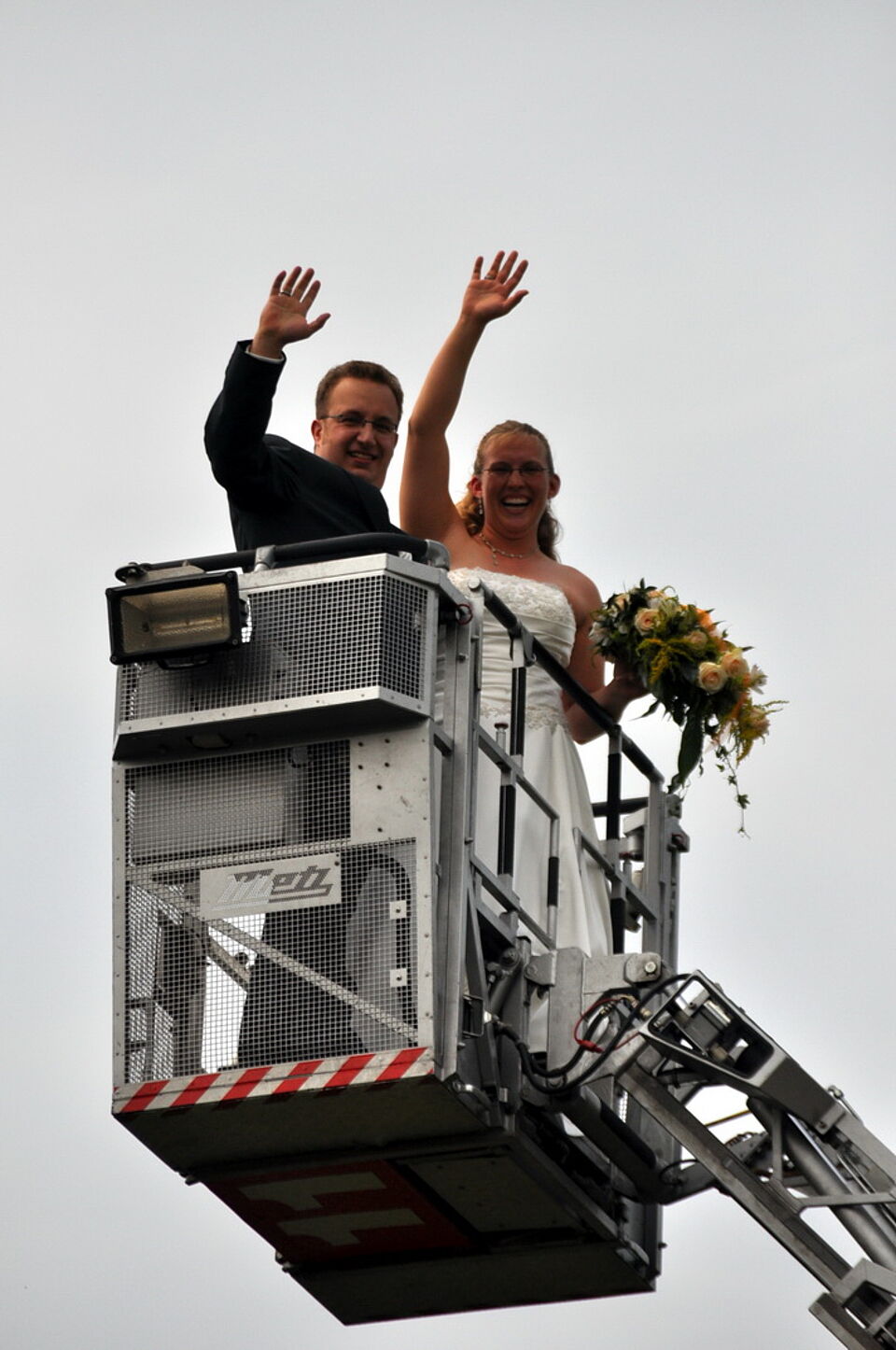 Einer der Höhepunkte für das neue Brautpaar dürfte sicherlich der Ausblick auf die Römerstadt aus gut 25 Metern Höhe gewesen sein. Denn die Kameraden der Feuerwehr luden sie zur Ausfahrt mit der Drehleiter durch die Römerstadt ein - unter dem Beifall der Hochzeitsgäste ging es für die beiden zum ersten Mal hoch hinaus.