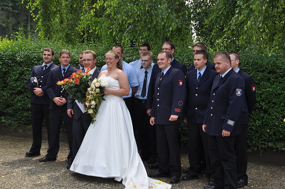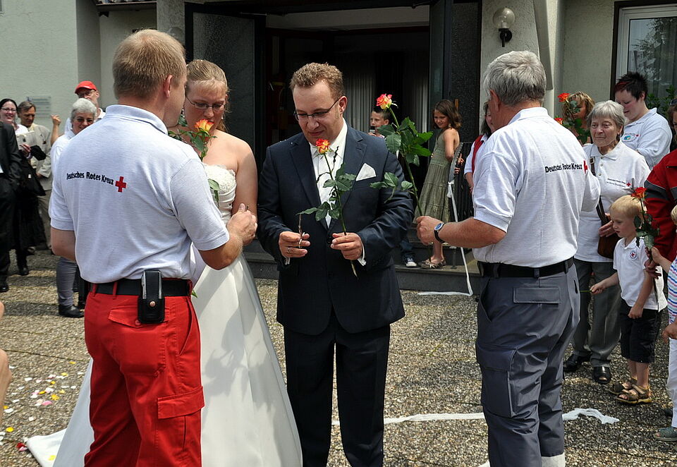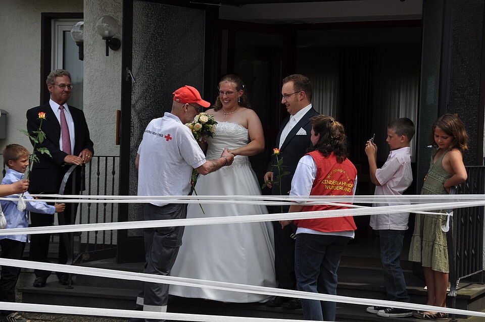 Standesgemäß mussten die beiden sich ihren Weg durch das Ehrenspalier "freischneiden": Die Rotkreuzler hatten den Weg mit Mullbinden versperrt. Direkt im Anschluß galt es, über Feuerwehrschläuche zu schreiten.