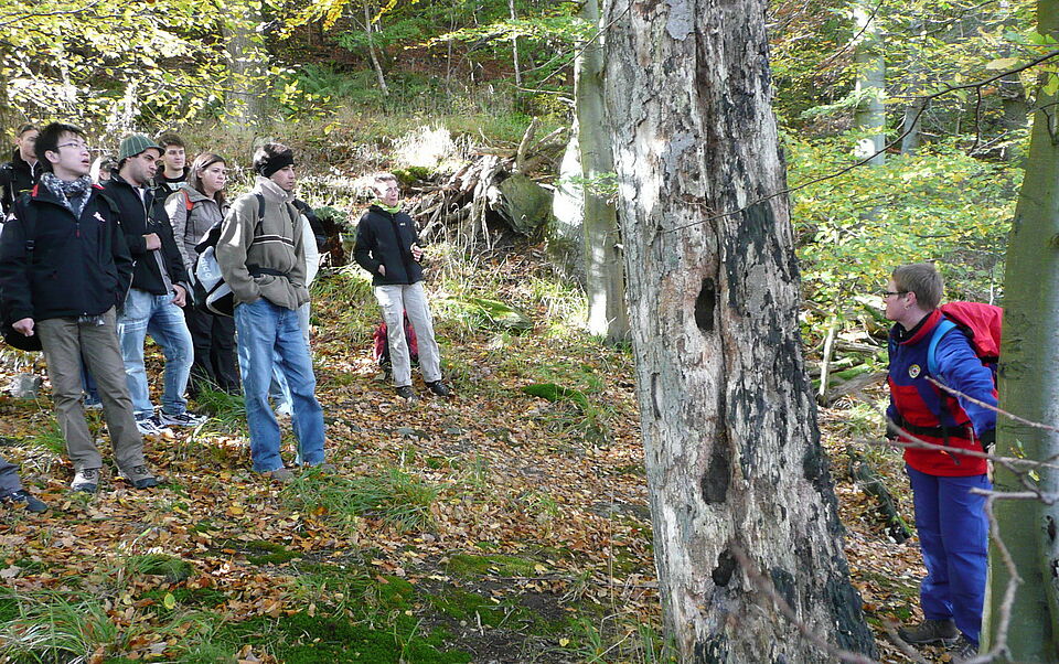 Bild DRK ZR | Hier erklärt Barbara Roitzheim die besondere Bedeutung von Totholz für die Artenvielfalt im Nationalpark Eifel. Ganz nebenbei lernten die Gäste den Unterschied zwischen Buche, Eiche, Birke, Fichte und Hainbuche kennen.