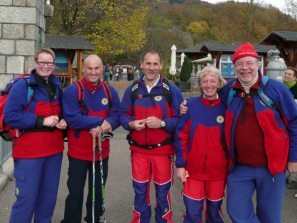 Bild DRK EU | An Samstag war die Rotkreuz Bergwacht im Nationalpark Eifel gleich doppelt gefordert. Während die Aachener Bergwachtler mit ihrem Leiter Achim Görke (2.vl) bei der WDR Zuschauerwanderung für Sicherheit sorgten, begleiteten die Euskirchener Kollegen eine Gruppe ausländischer Studenten durch die traumhafte Eifeler Natur.