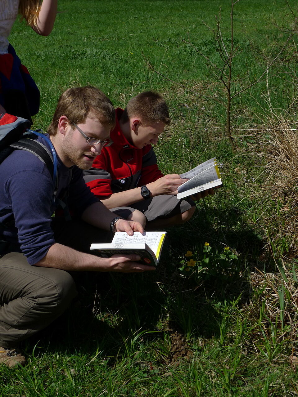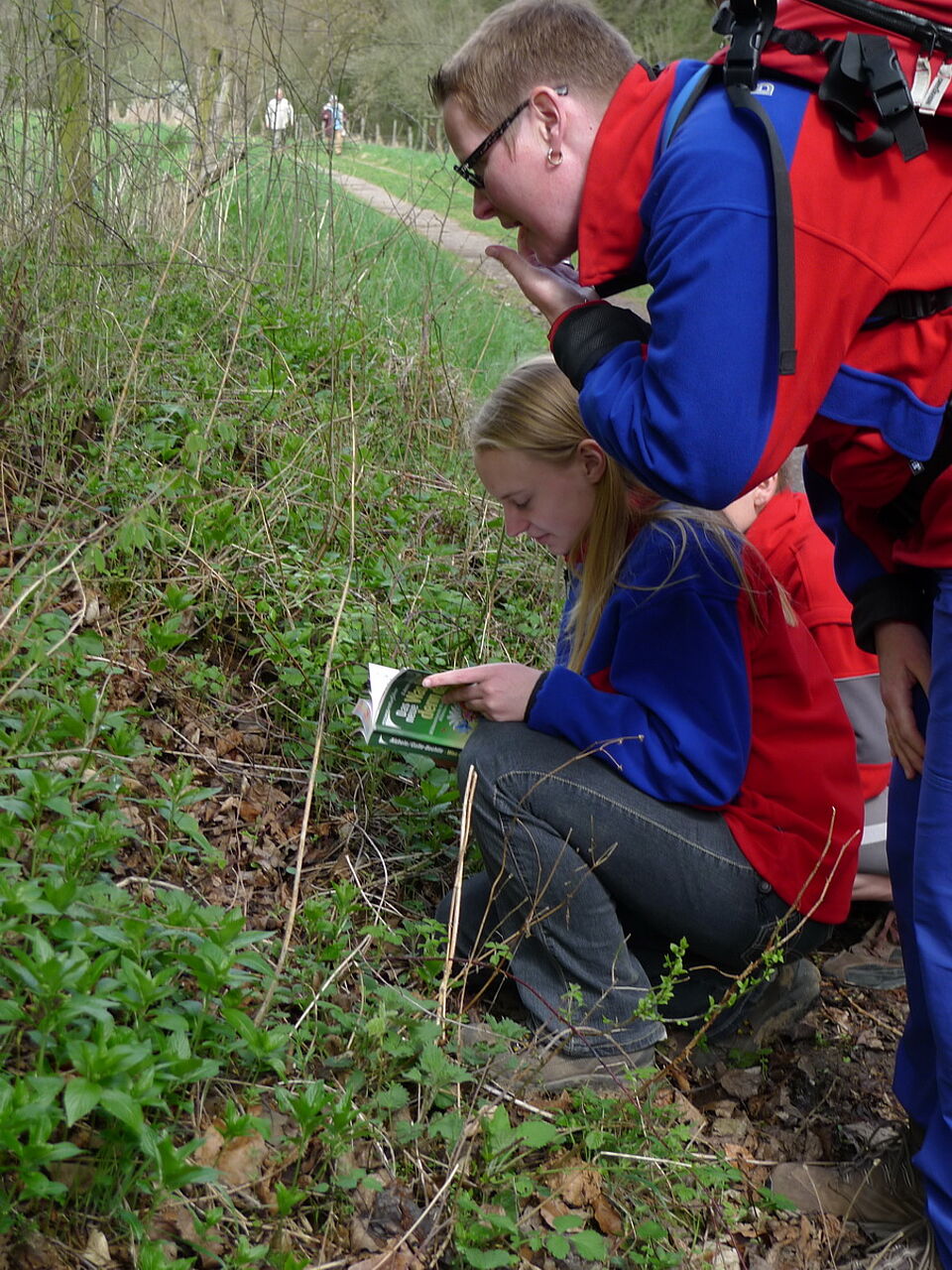 Bild DRK ZR | Bestimmungsübungen am Teichrand. Die gelbe Blütenpracht der Sumpfdotterblume ist hier leider kaum zu erkennen.