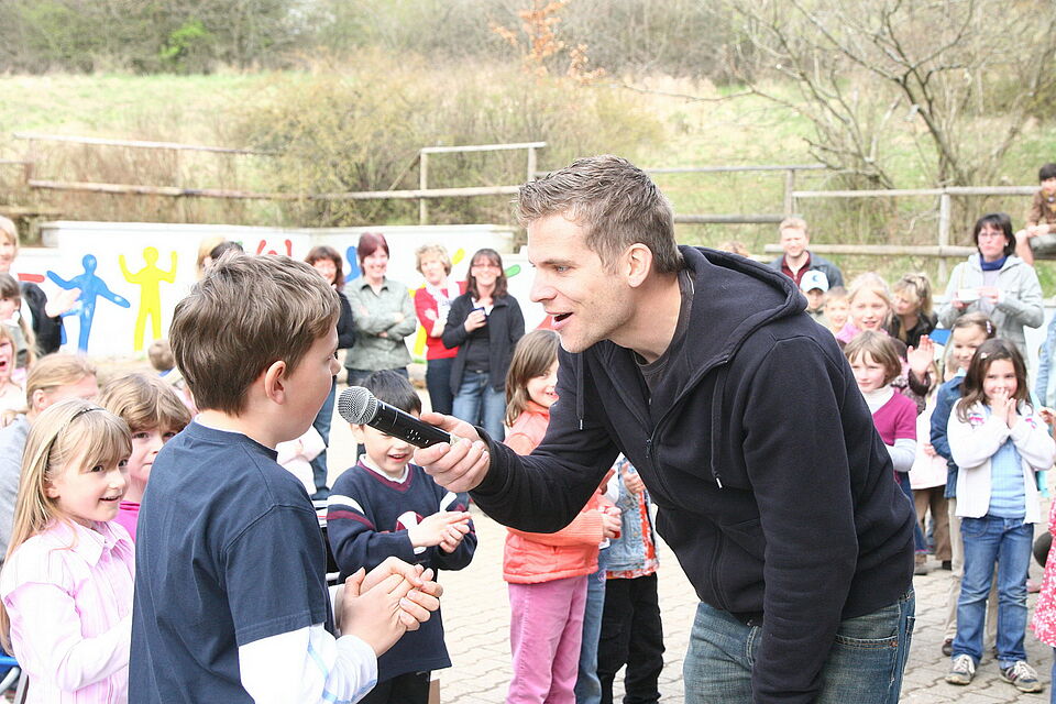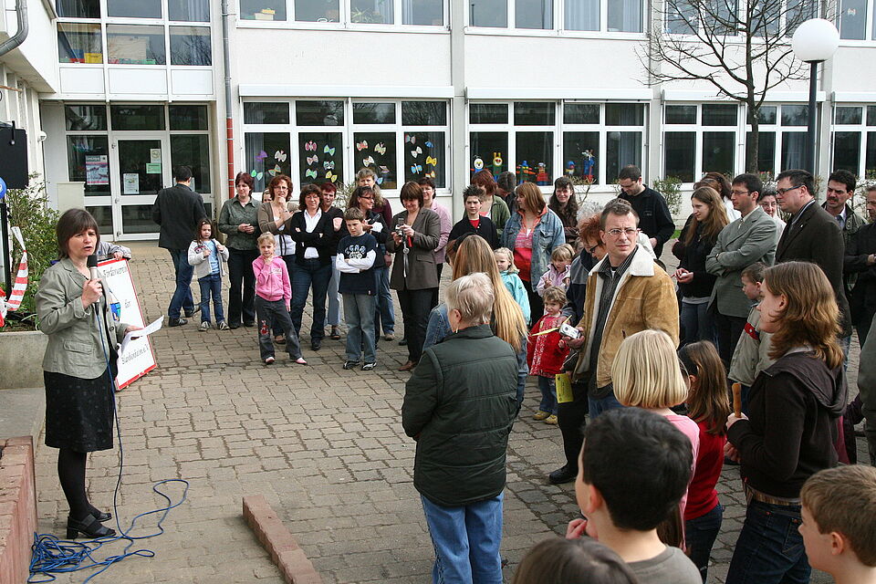 Etwa 70 Eltern und Kinder waren zu der kleinen Eröffnungsfeier gekommen. Die Mensa mit der kleinen Küche wurde gleich beim Büffet ausgetestet, im künftigen Ruheraum gab es eine kleine Kunst-Ausstellung mit Werken der Schüler aus der Betreuung, und auf dem Schulhof konnten die Kinder Dosen-Werfen und Riesen-Memory spielen. Begeistert waren die Kinder auch vom Golbacher Sänger Uwe Reetz, der zusammen mit den „Pänz“ von der Freundschaft sang.
