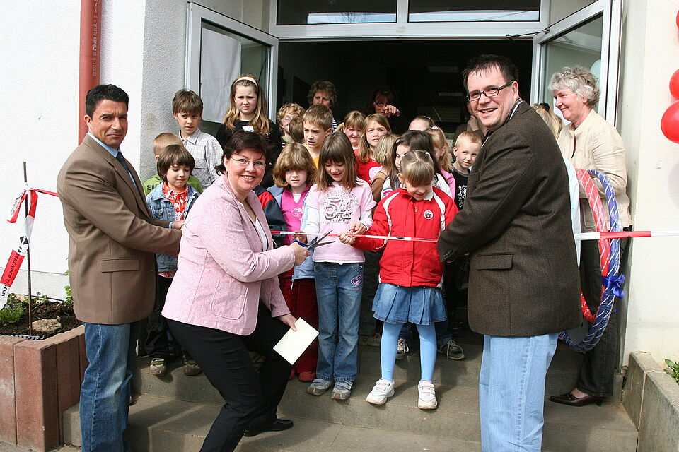 Gemeinsam mit Kerstin Müller vom Betreuungsverein, Annemarie Wall, der Schulleiterin, und Fachbereichsleiter Bodo Freobus als Vertreter des Roten Kreuzes, dem Träger der Übermittagsbetreuung, präsentierte Hartmann den An- und Umbau.