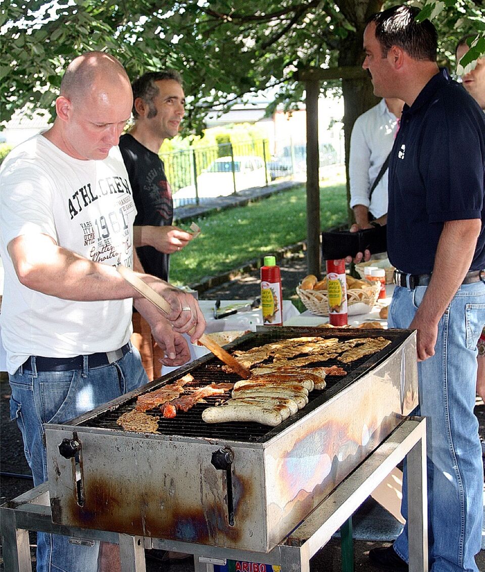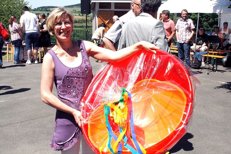 Ein ungleich größeres Geschenk hatte die Elternratsvorsitzende Anja August mitgebracht: Im Namen der „Rokki“-Eltern schenkte sie Irene Müller einen Riesenkreisel. Auch Christoph Ohlert und Guido Mombach, die am Grill für das leibliche Wohl der Gäste sorgten, gehören dazu. „Rokki“-Vater Ohlert begründete, warum die beiden Kinder der Familie in Nöthen sind: „Wir wohnen in Holzheim, da wäre der Kindergarten in Harzheim genauso weit entfernt. Wir haben uns für Nöthen entschieden, weil der Rotkreuzkindergarten einen guten Ruf hat.“