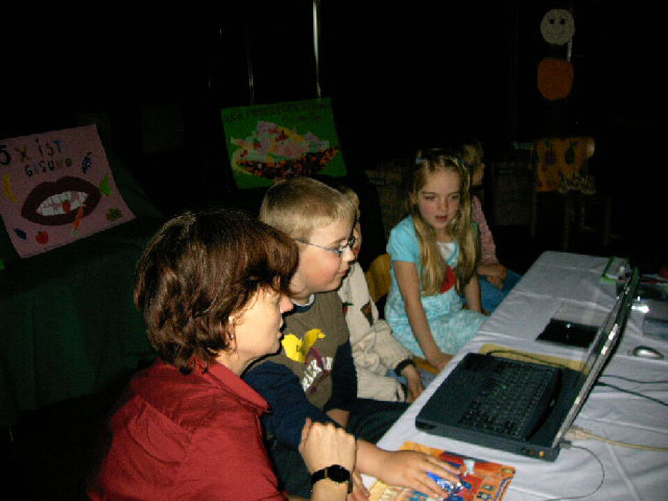 Die Ernährungsberaterin Sabine Fewson berichtete den Kindern, was Obst und Gemüse so gesund mache – nämlich Vitamine und Ballaststoffe. Mit speziellen Computerprogrammen konnten die Kinder einiges über Ernährung lernen: Mit „Bobby Banana“, einer Computerfigur, stellten die Kinder einen Obst-Salat zusammen. Dazu konnten sie eine Vielzahl an Obst und Gemüse in die virtuelle Schüssel auf dem Bildschirm legen. In einer Tabelle war dann sofort zu sehen, ob das ausgesuchte Obst oder Gemüse reich an Vitamin A, Vitamin C oder Ballaststoffen ist.