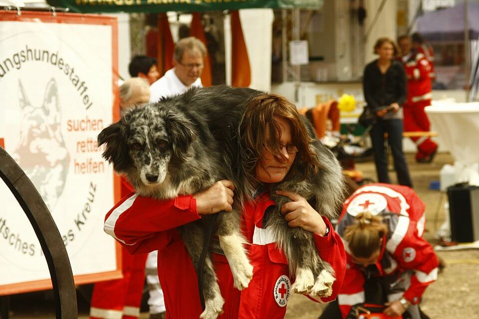 Aus dem Kreis Euskirchen unterstützten Kräfte der Rotkreuz-Rettungshundestaffel Kall ihre Kollegen aus Alzey und Kirchheimbolanden, die erstmalig gemeinsam auf dem Messegelände mit drei Vorführungen Informationen und Einblicke in die Aufgaben und Tätigkeiten der Suchhunde gaben.
