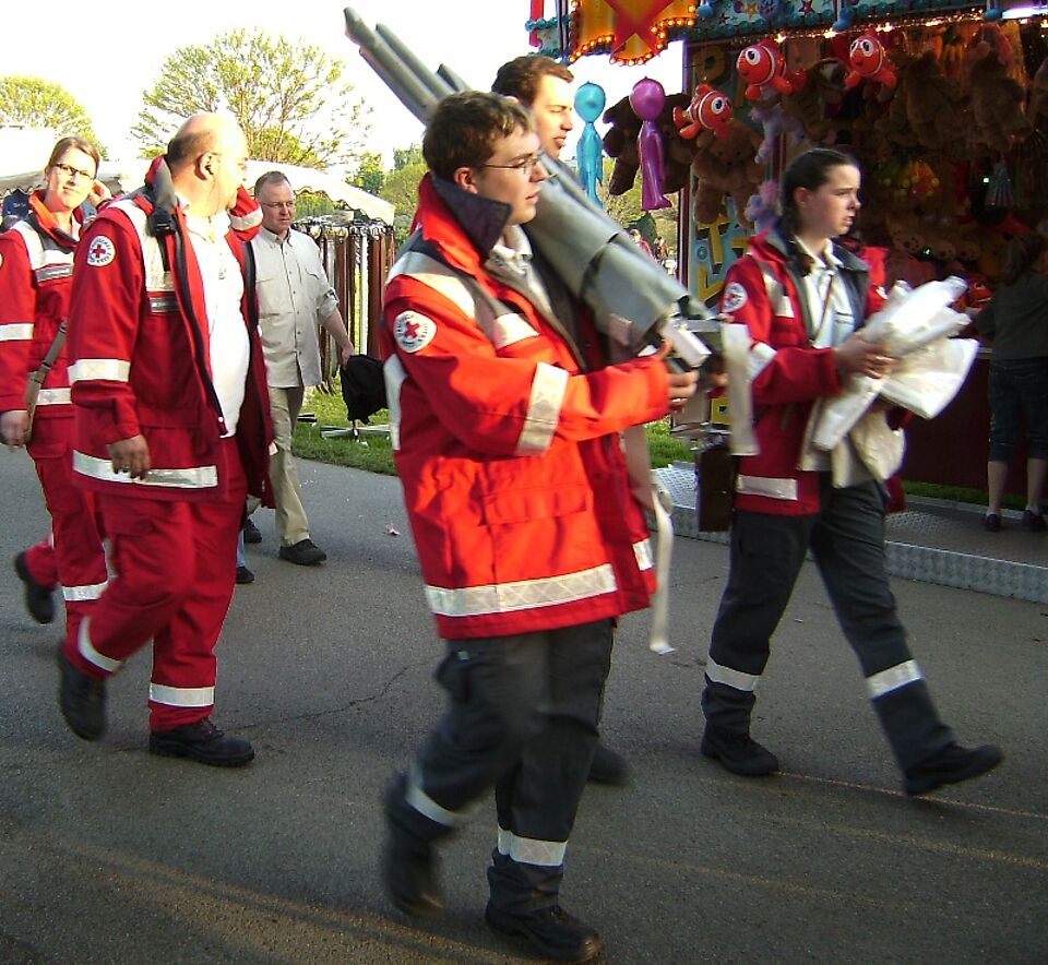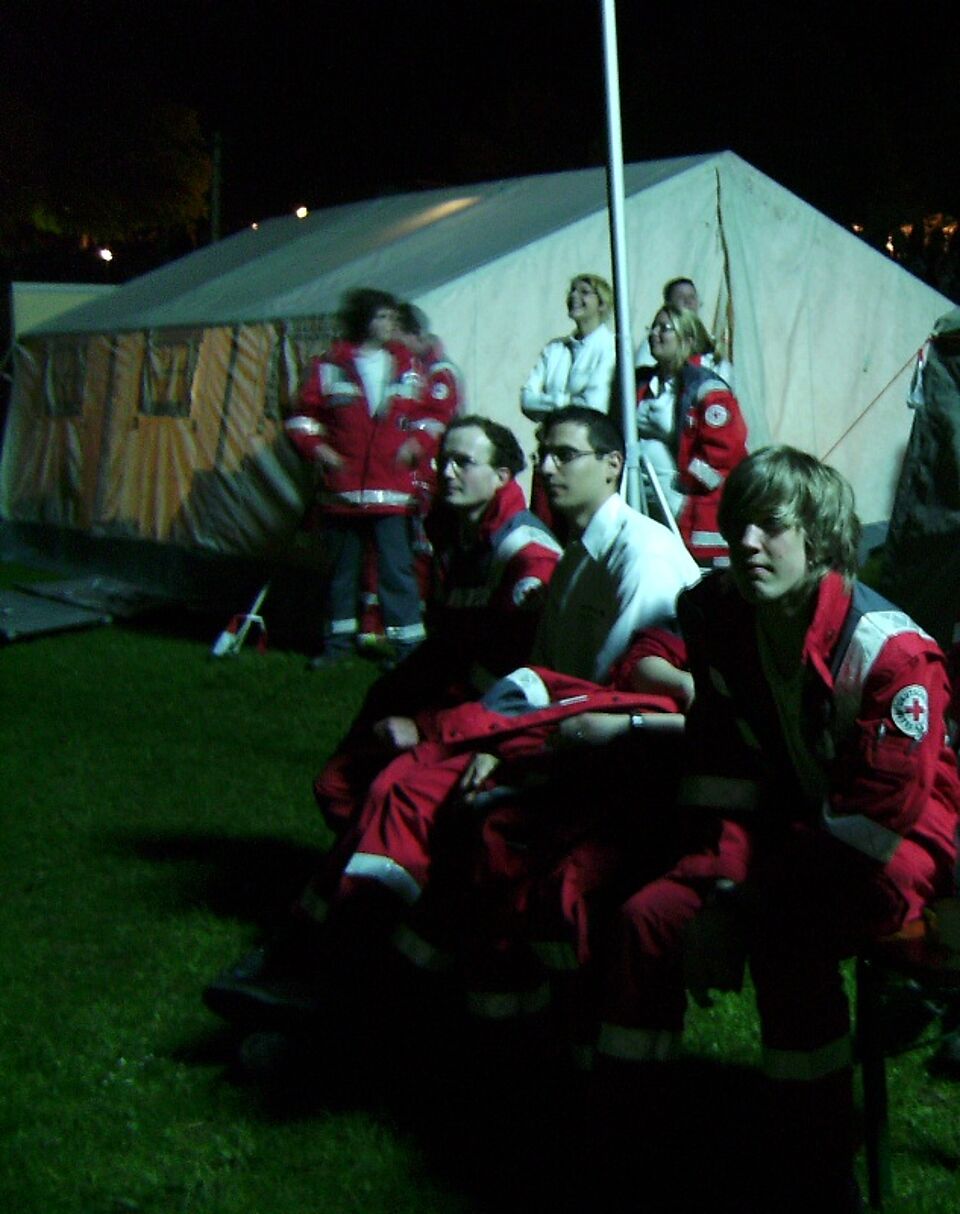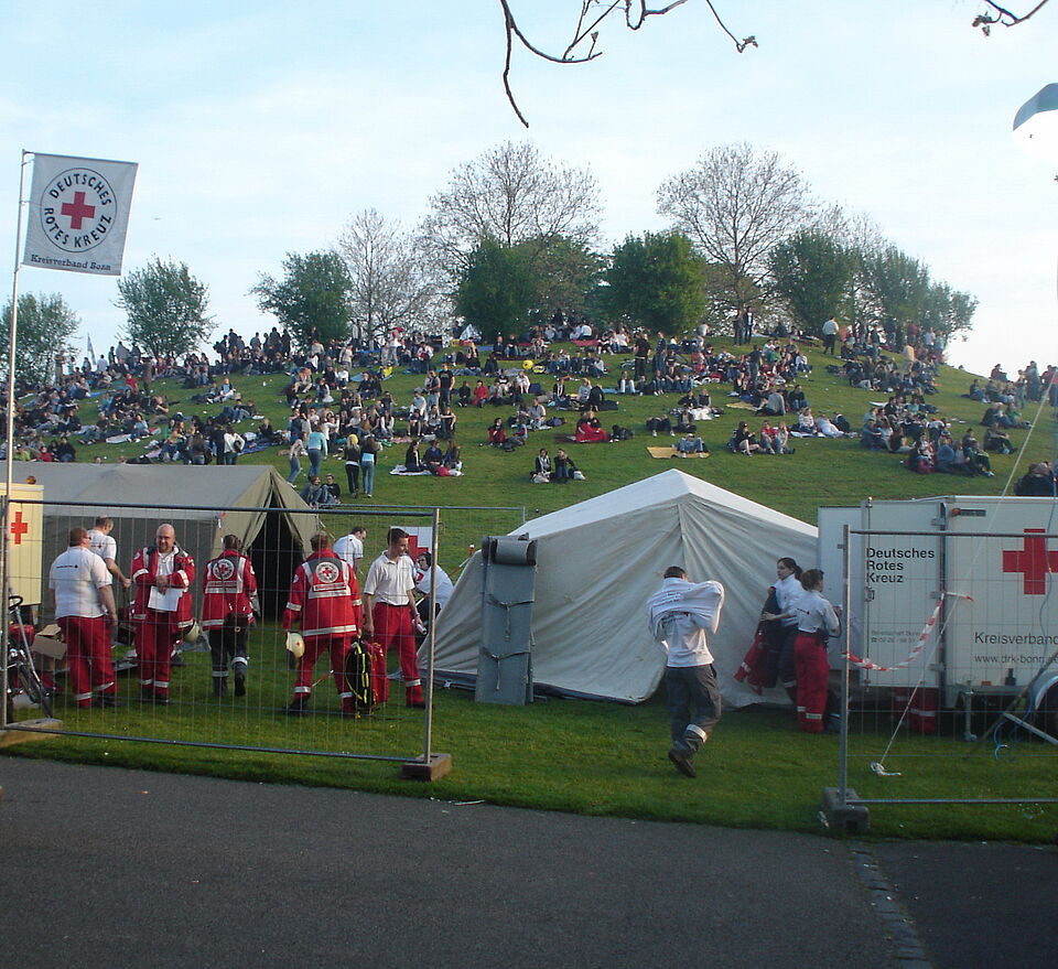 Unterteilt in zwei Sanitätstrupps zu je sieben Helfern rückten sie im Laufe des Abends zwölf mal aus, um irgendwo im weitläufigen Gelände nicht gehfähige Personen aufzusammeln und zur UHS zu bringen. Oft mussten stark alkoholisierte Jugendliche transportiert werden. Die Bonner Kollegen der UHS übernahmen diese dann in ihr Behandlungszelt, wo die Patienten entsprechend versorgt wurden. Insgesamt kamen so am Abend allein an der UHS Blumenwiese 46 Hilfeleistungen zustande.