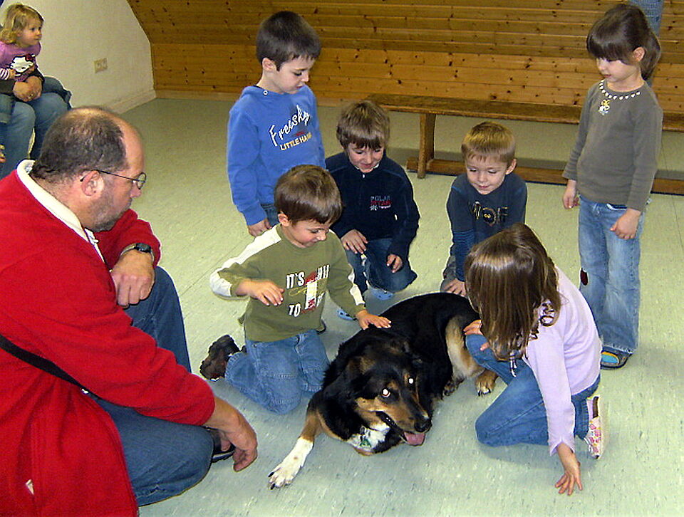 Außerdem erzählte er den aufmerksam lauschenden Kindern, wie ein Rettungshund die Aufgabe bewältigt, vermisste Personen aufzuspüren. Mit der gehorsamen „Lena“, die zwar kein Rettungs-, aber ein ausgebildeter Besuchshund ist, demonstrierte er, worauf es bei der Erziehung ankommt: