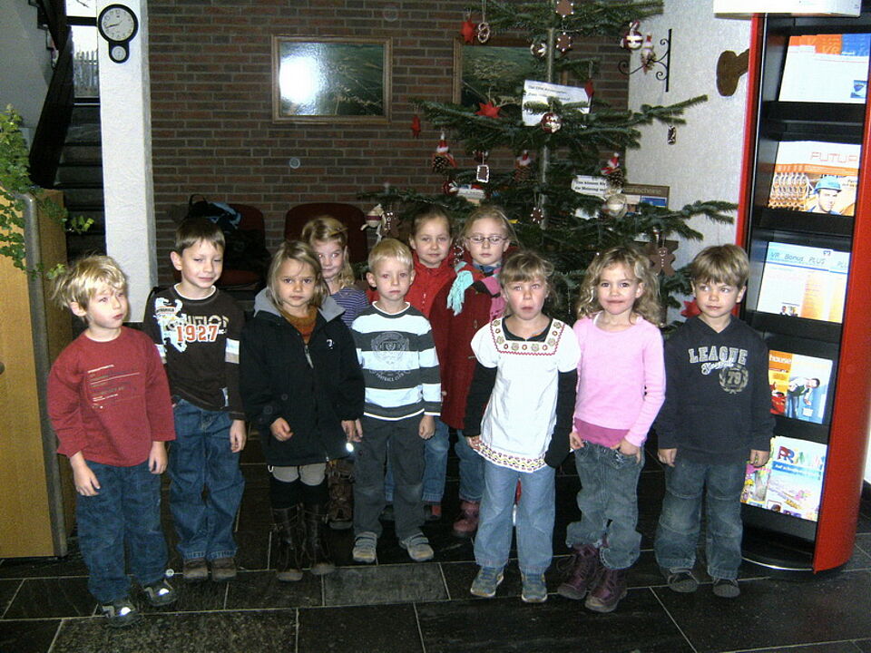 Blankenheim - Wir, die Vorschulkinder des DRK-Kindergartens "Kastanienlaube" in Ripsdorf, wurden am Montag, den 30.11.09, in Fahrgemeinschaften um 8.30 Uhr zur VR Bankfiliale in Lommersdorf gebracht. Dort angekommen schmückten wir mit Frau Peetz und Frau Kremer den schon aufgestellten Weihnachtsbaum mit selbstgebasteltem Weihnachtsschmuck.