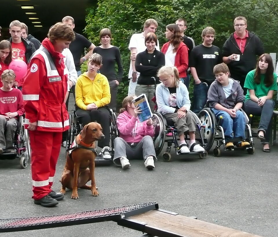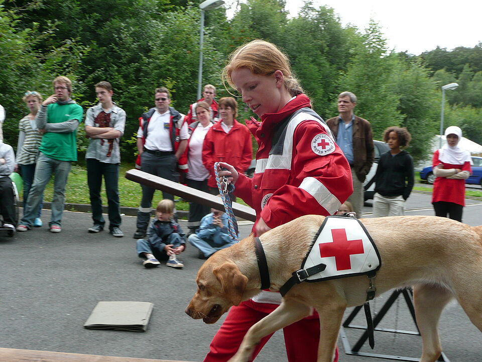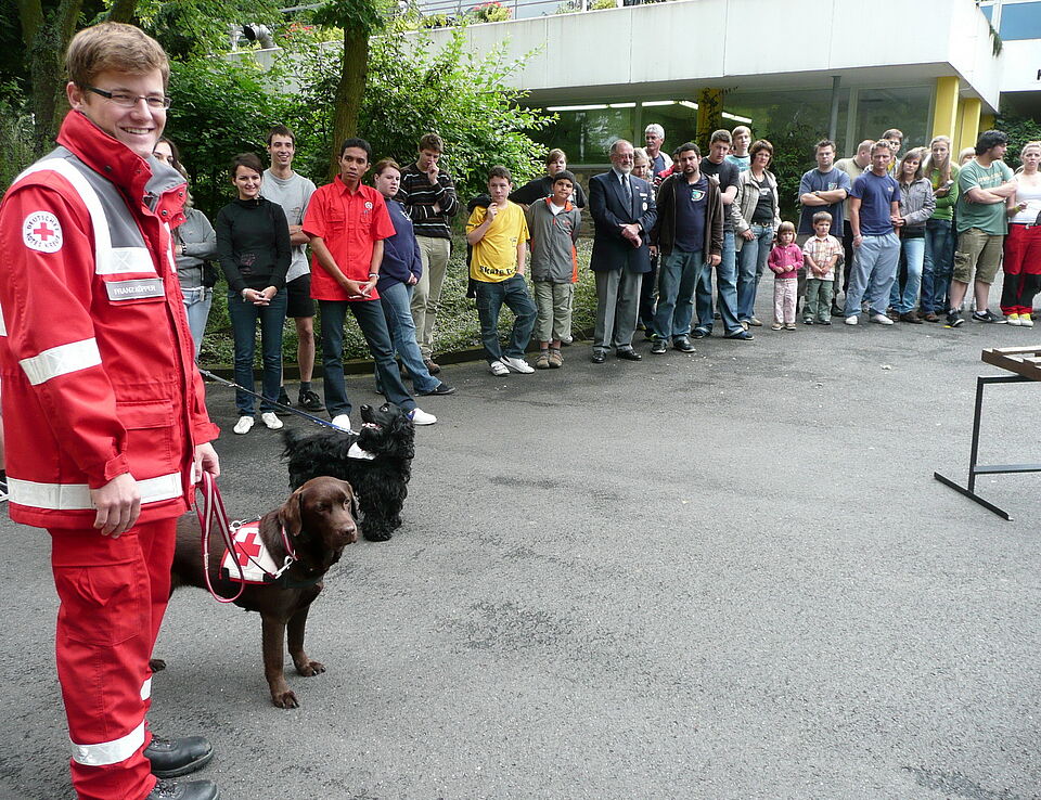 Bild DRK ZR | Die Kaller Rotkreuz-Hundestaffel mit ihrem Staffelleiter Franz Küpper (l.) zeigte einen Teil der Möglichkeiten der Rettungshundearbeit.