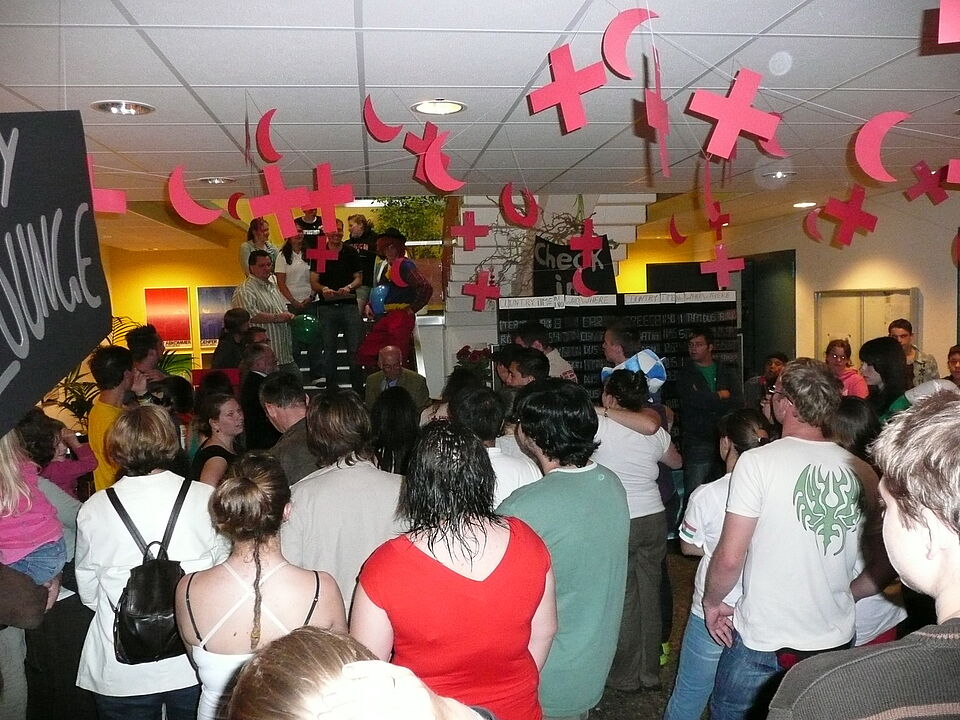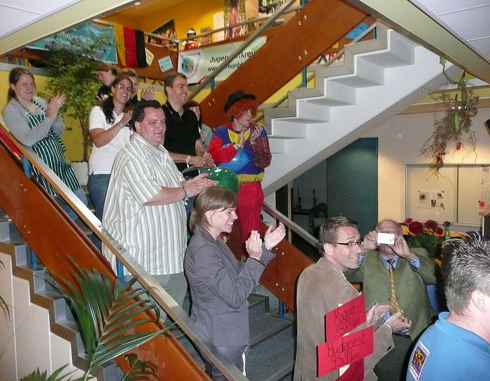 Bild DRK ZR | In der Eingangshalle der Rotkreuz-Bildungsstätte wurden die Gäste mit einem bunten Programm und einer großen Ausstellung über die internationale Arbeit des Jugendrotkreuzes empfangen.
