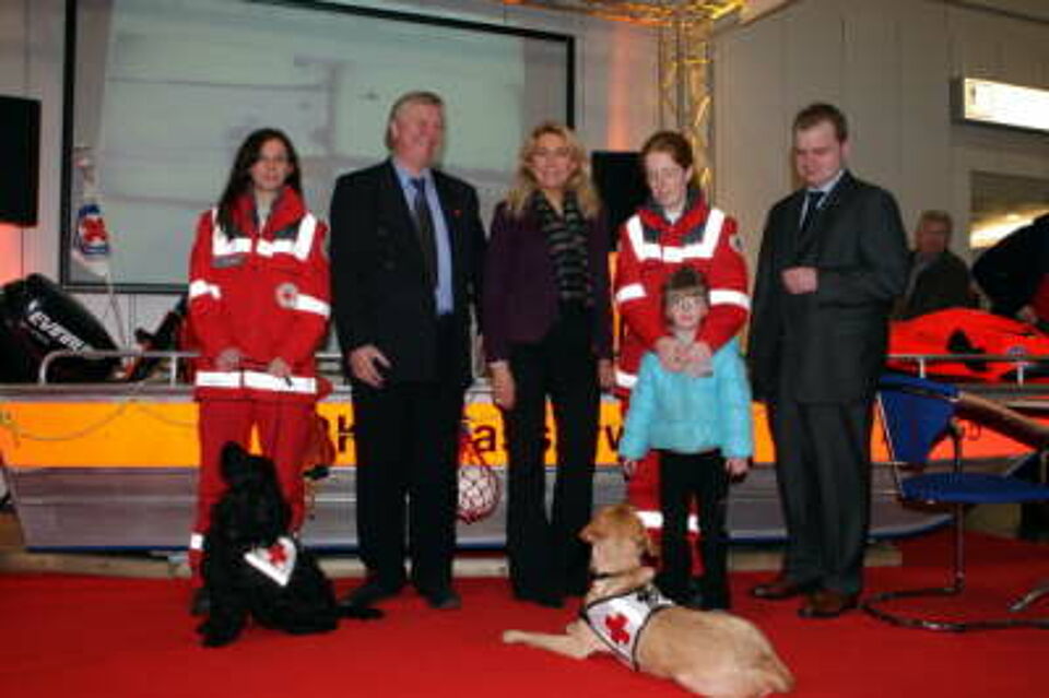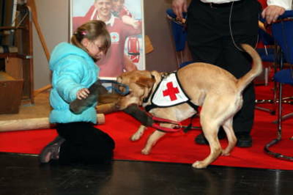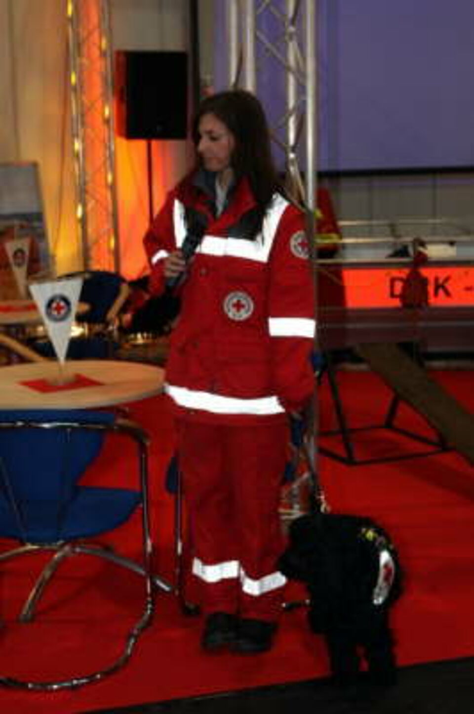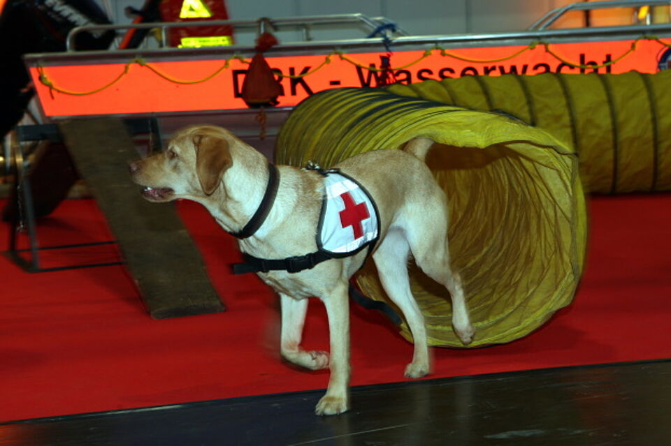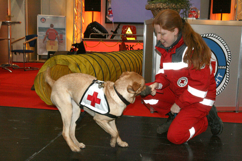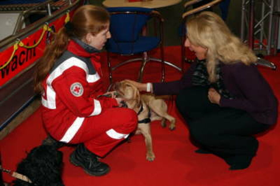 Auf der Wassersportmesse "boot" zeigt Aika an der Hand der Hundeführerin Melanie Rarey, was sie kann, zusammen mit dem vierbeinigen schwarzstrubbeligen "Kollegen" Merlin. Was hat der Wassersport, was hat die Wasserwacht mit Rettungshunden zu tun. Julia Tiede, die zweite Hundeführerin von der Rettungshundestaffel Kall in der Eifel, erklärt dem interessierten Publikum, das sich immer wieder am DRK-Stand sammelt: "Rettungshunde können mit der Nase auch Menschen unter Wasser aufspüren." Was also im Erdbebengebiet schon vielfach erfolgreich bewiesen ist, das ist auch eine Angelegenheit der Wasserrettung.