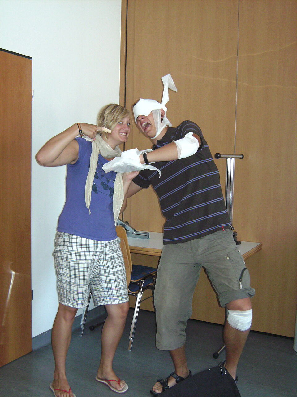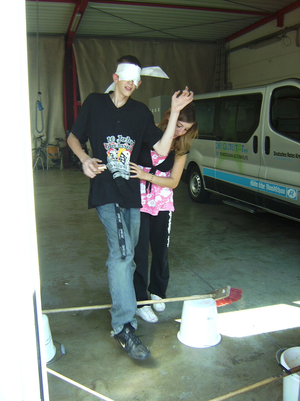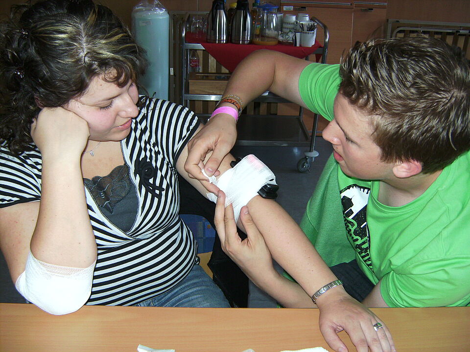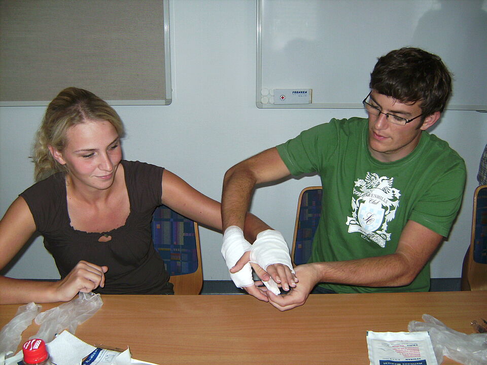 Zum Beispiel am Ambu-Man, einer Reanimationspuppe, dessen Brust im Sambarhythmus gepresst wird. Mit Verbänden hingegen wird an realen Personen herumgebastelt. Da scheint kurzzeitig keine neue Generation von Rotkreuzlern zu sitzen, sondern die Opfer einer Massenkarambolage. Die Tische sind mit Verbänden wie von einer Schneedecke bedeckt, ebenso Hände, Arme und Köpfe der Teilnehmer. Und mit einem Augenverband versehen entkommt auch niemand dem Vergnügen, sich von seinem Partner über das Gelände führen zu lassen. Eigentlich sollte es als Qualitätsmerkmal der Teilnehmer gelten, dass bei diesem Rundgang keine realen Wunden entstanden sind.