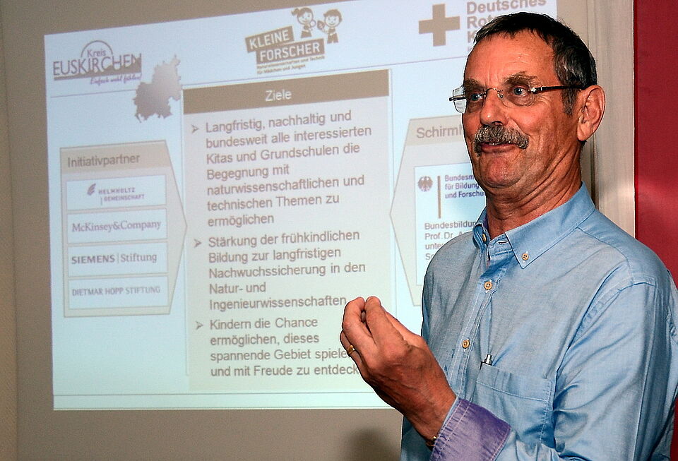 Im Anschluss an die Spendenübergabe erläuterte Rolf Klöcker das Projekt „Haus der kleinen Forscher“, dessen Schirmherrschaft das Bundesministerium für Bildung und Forschung übernommen hat. „Es geht darum, bei Kindern die Begeisterung dafür zu wecken, ihre Umwelt zu verstehen, dass sie lernen, naturwissenschaftliche Fragen zu stellen, und im Rahmen von Experimenten spielerisch lernen.“ Im Idealfall, so Klöcker, würden dabei bei manchen Kindern auch die Weichen für spätere Entscheidungen in der Bildungsbiographie beziehungsweise Berufswahl gestellt: „Das ist ein durchaus erwünschter Nebeneffekt“.