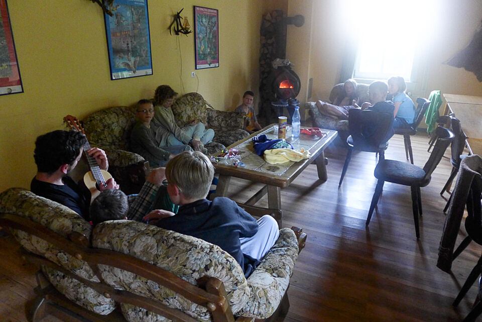 Schnell war ein Feuer im Kamin angezündet und die gute Laune kehrte wider ein. Aber da waren noch drei andere Gruppen. Sie waren schon weiter auf dem Weg nach Wolfgarten unterwegs.