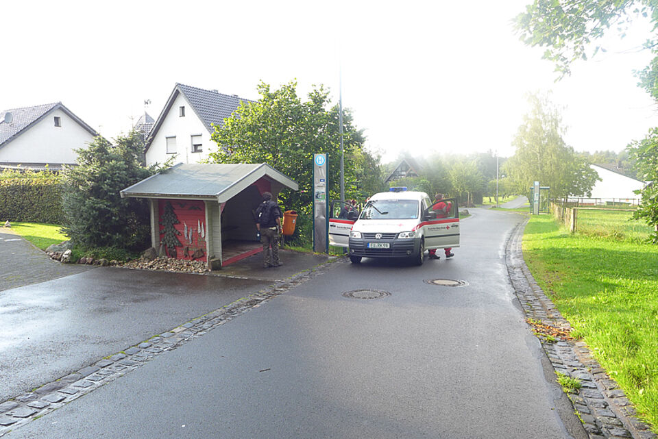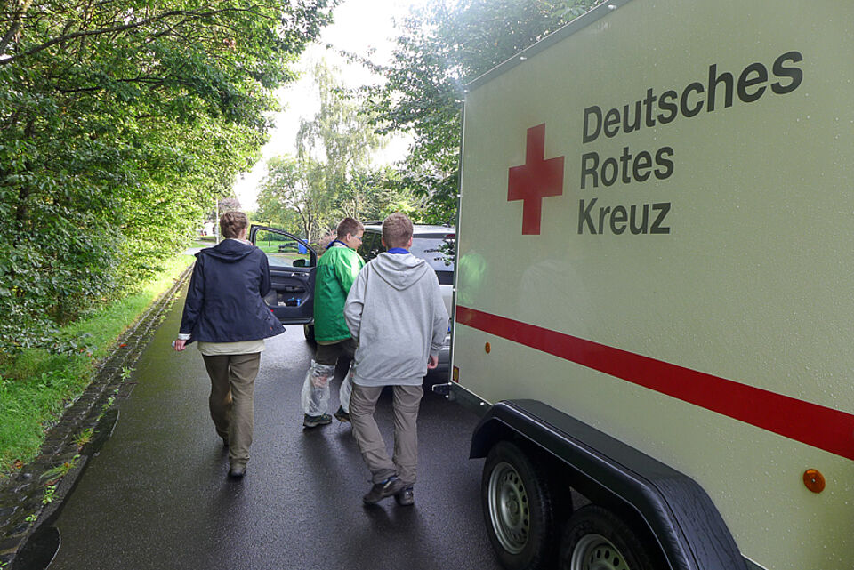Am dritten Tag sollte die Tour von Gemünd über Vogelsang nach Wolfgarten führen. Aber da öffnete der Himmel seine Schleusen wieder einmal so richtig. Die letzte der vier Kleingruppen erreichte total durchnässt Vogelsang und entdeckte bei der Suche nach einem Notquartier das Transit 59 des DRK. Könnte man da unterkommen? Das war für das Team vom Roten Kreuz keine Frage. Also herein in die gute Stube.