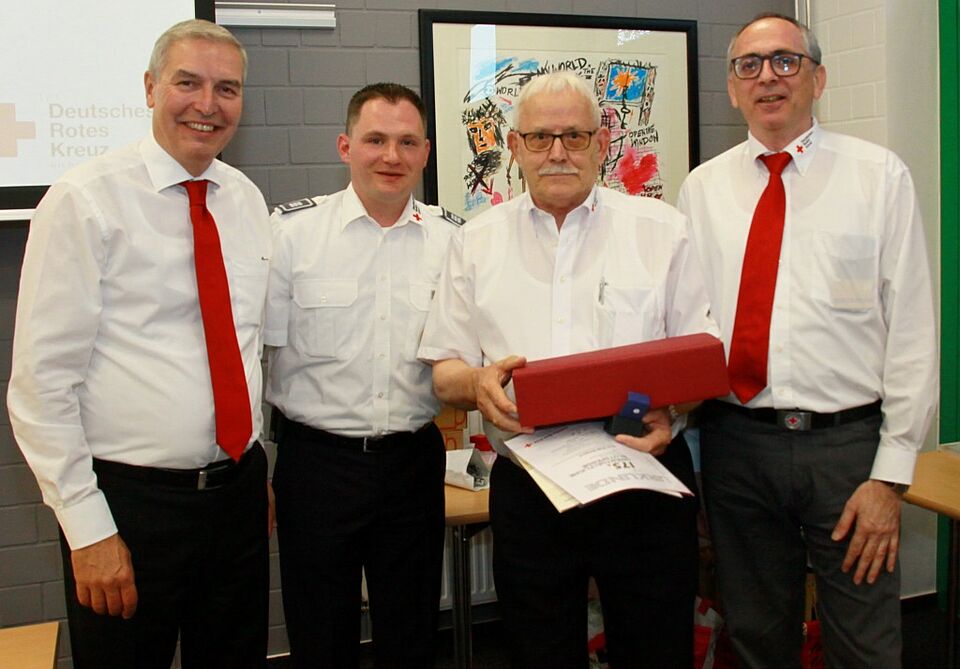 Auch wenn die moderne Datenverarbeitung nicht erfasst hat, seit wie vielen Jahren die Damen in Schleiden bei den Blutspenden im Dienst der guten Sache aktiv sind, sollten sie nicht ohne Würdigung bleiben, hatte Christopher Kettner mit dem Vorstand des Ortsvereins beschlossen. Zwar könne so nicht genau recherchiert werden, seit wann Gertrud Hilgers, Thea Göbgen, Klara Gerhards und Hildegard Schumacher die Blutspenden im Ortsverein und das Seniorencafé betreuen, doch für Bereitschaftsleiter Christopher Kettner war klar: „Es müssen Jahrzehnte sein.“ Er dankte ihnen mit einem großen Blumenstrauß und einer herzlichen Umarmung. Für ihren Einsatz bei den Blutspenden wurde auch Monika Esser geehrt. Für 30 Jahre Mitgliedschaft beim DRK Ortsverband Schleiden wurde Andreas Pawlak geehrt. Seit 20 Jahren ist Christopher Kettner Mitglied des Ortsverbandes.